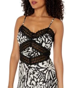 - Look chic wearing the Betsey Johnson® Blurred Lines Printed Dull Charmeuse Slip Dress that features contrasting trims on the neckline and front.