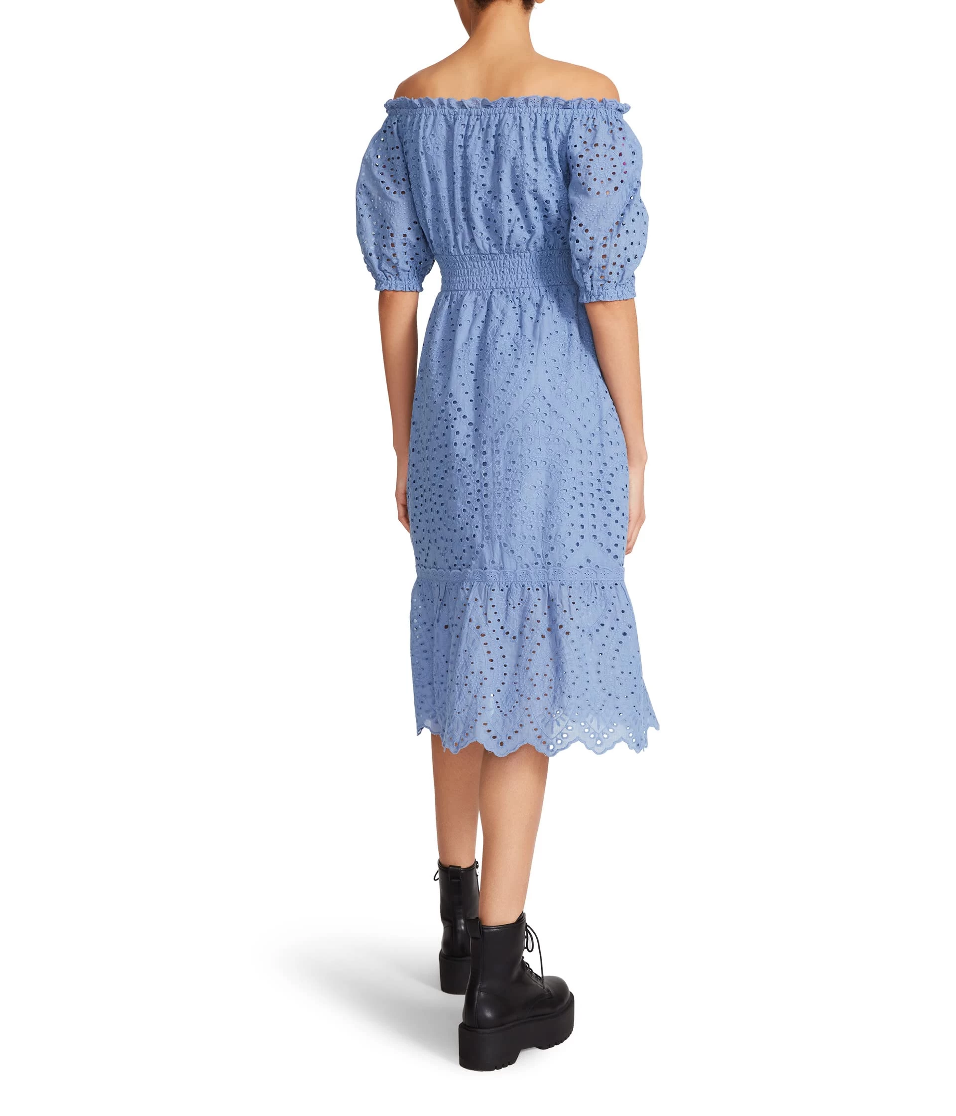 - Look absolutely gorgeous without losing comfort wearing the Betsey Johnson® Off Shoulder Cotton Eyelet Midi Dress.