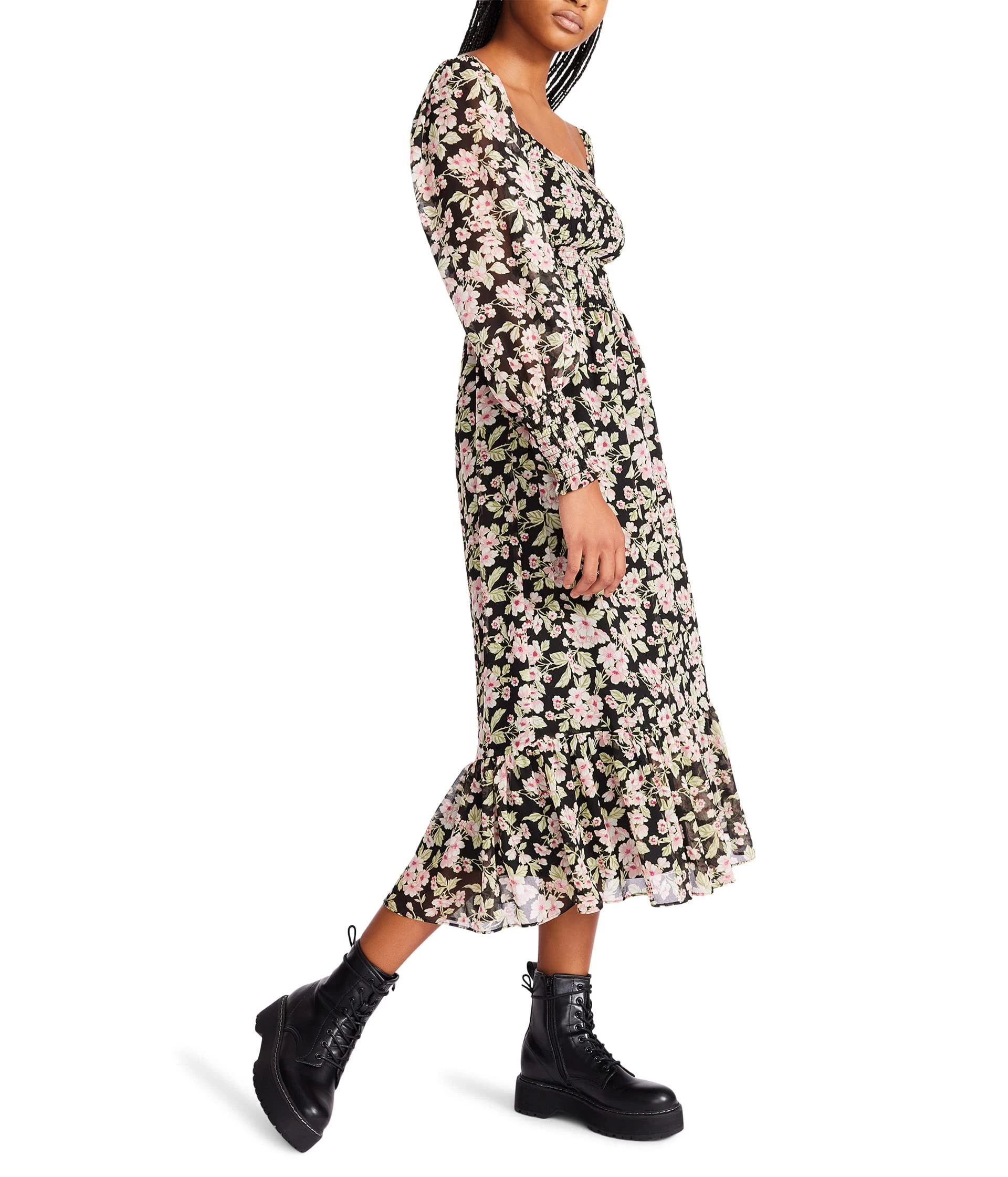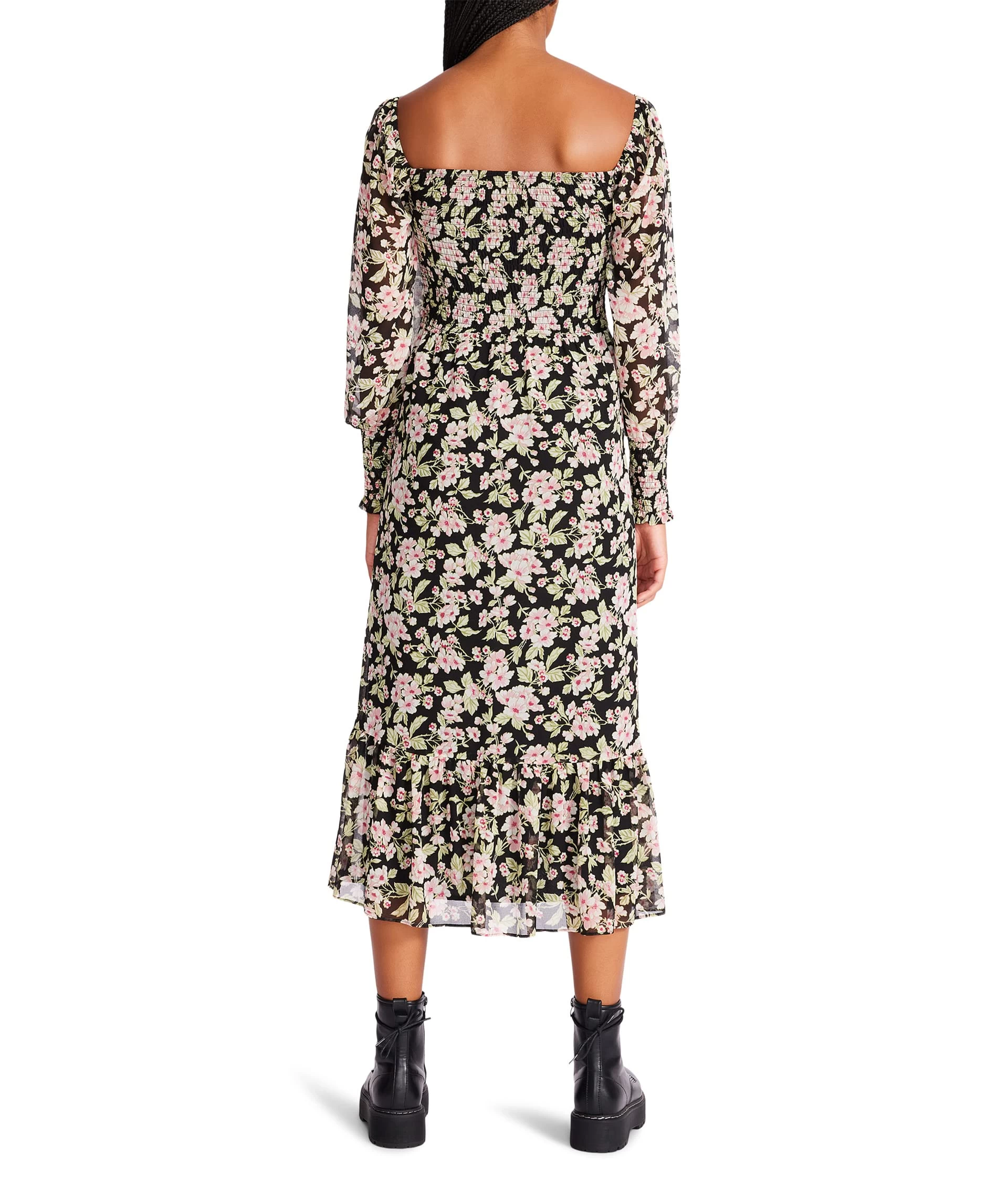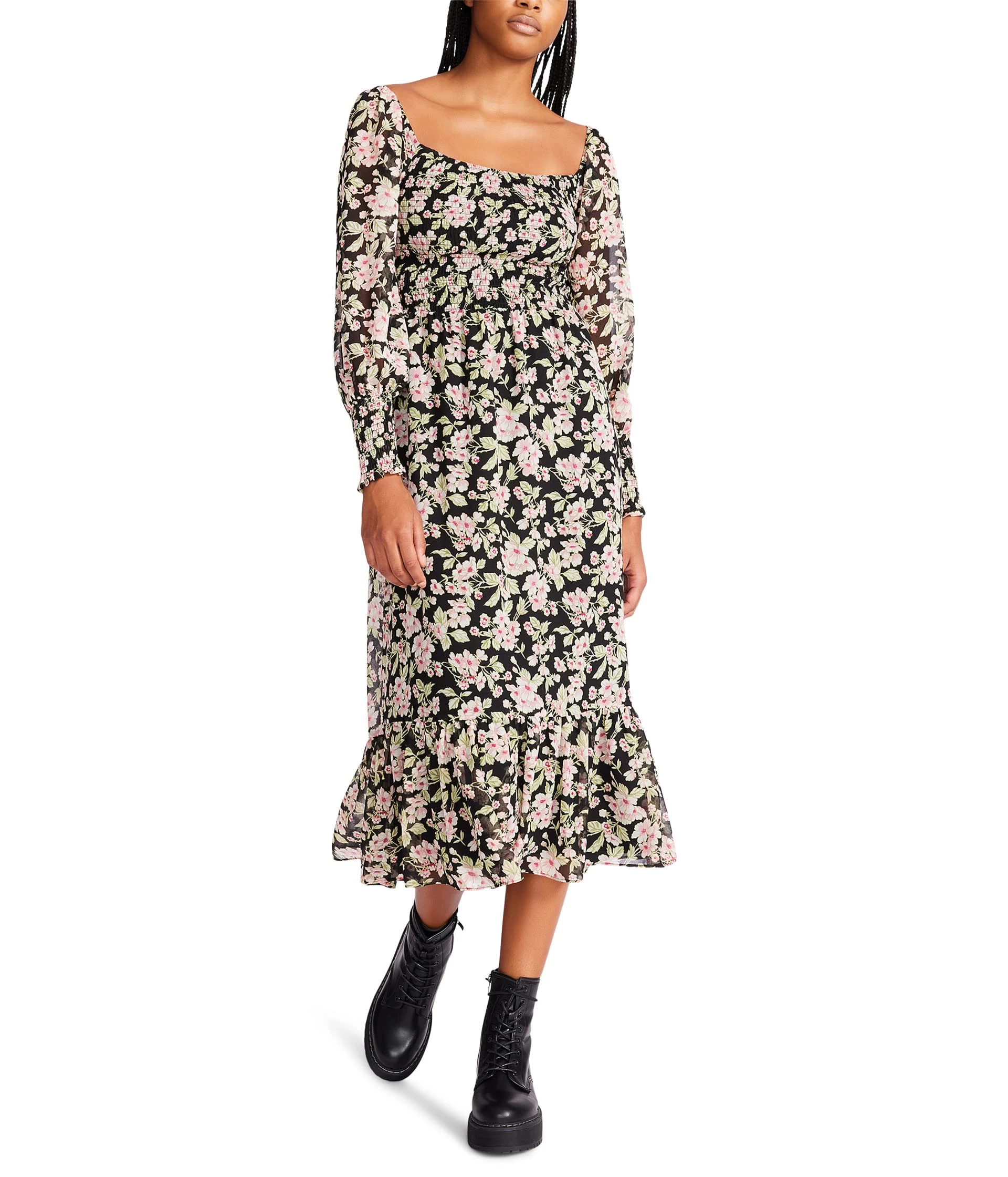 - Uplift your class of fashion apparel collection adding Betsey Johnson® Romantic Floral Smocked Printed Chiffon Midi dress.