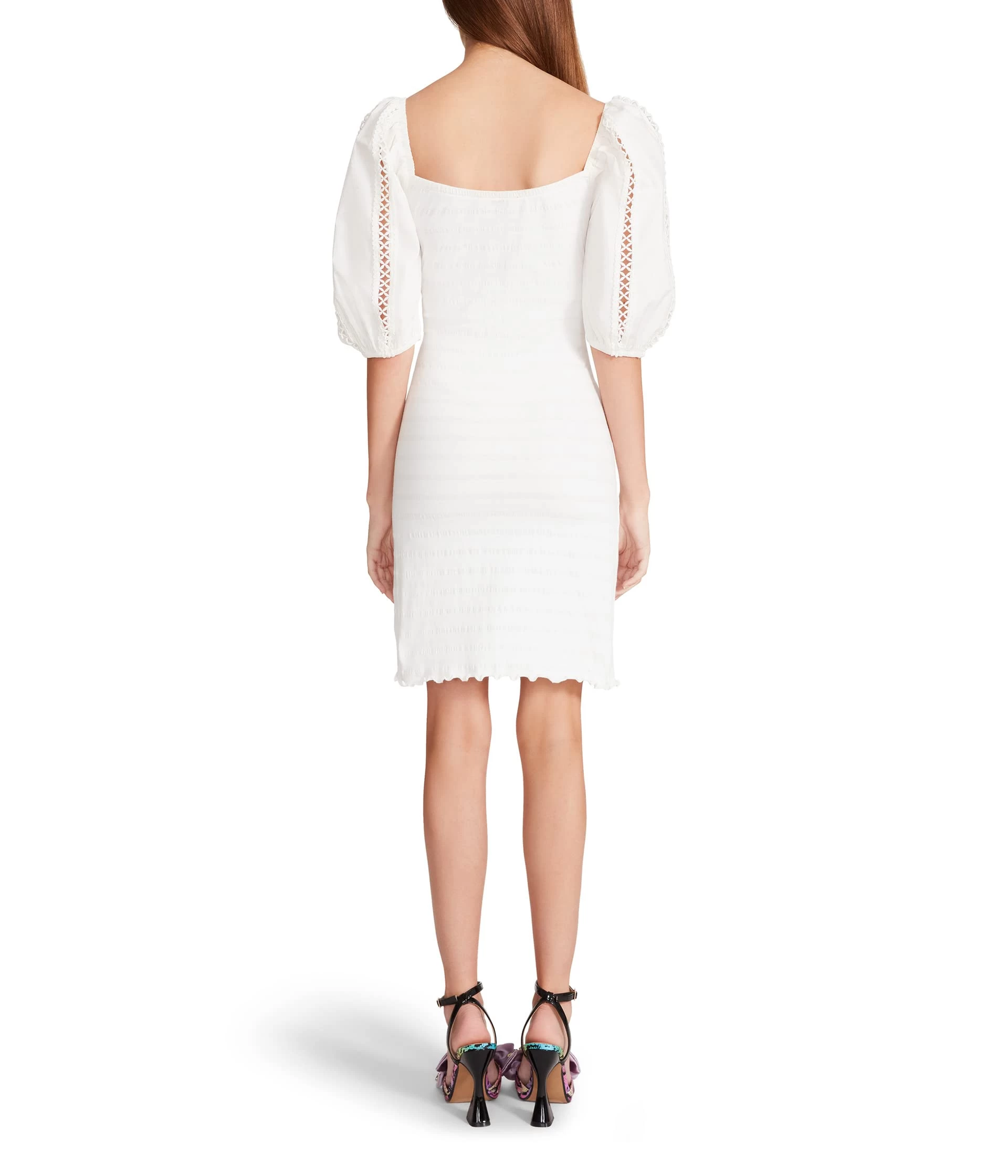 - Look chic and enhance your fashion appeal wearing the Betsey Johnson® Smock Knit Poplin Sleeve Dress that is designed on a bodycon silhouette.