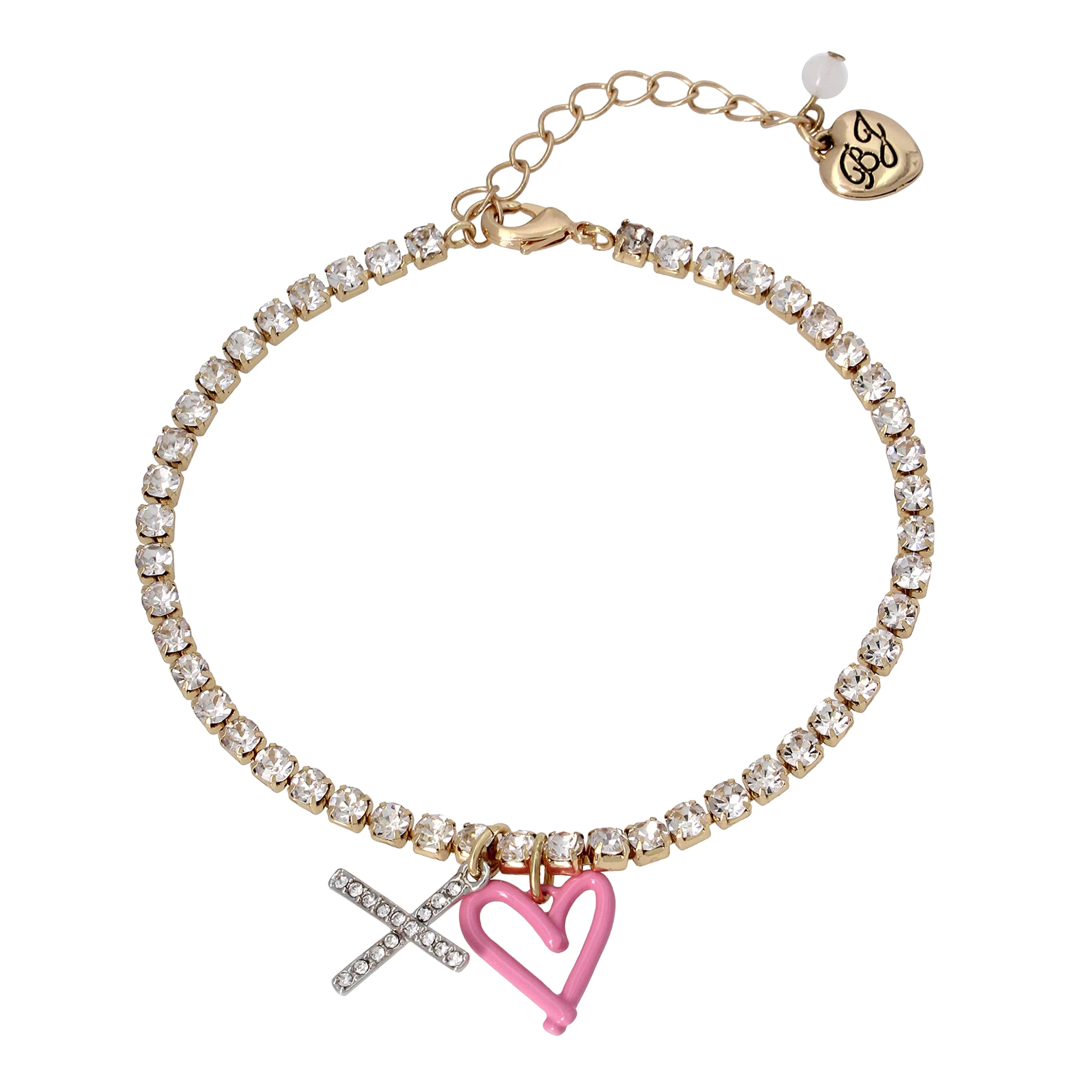 - Glistening tennis anklet adorned with x and open heart charms at center.