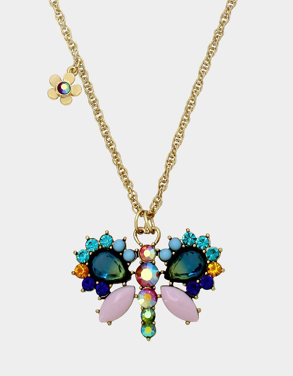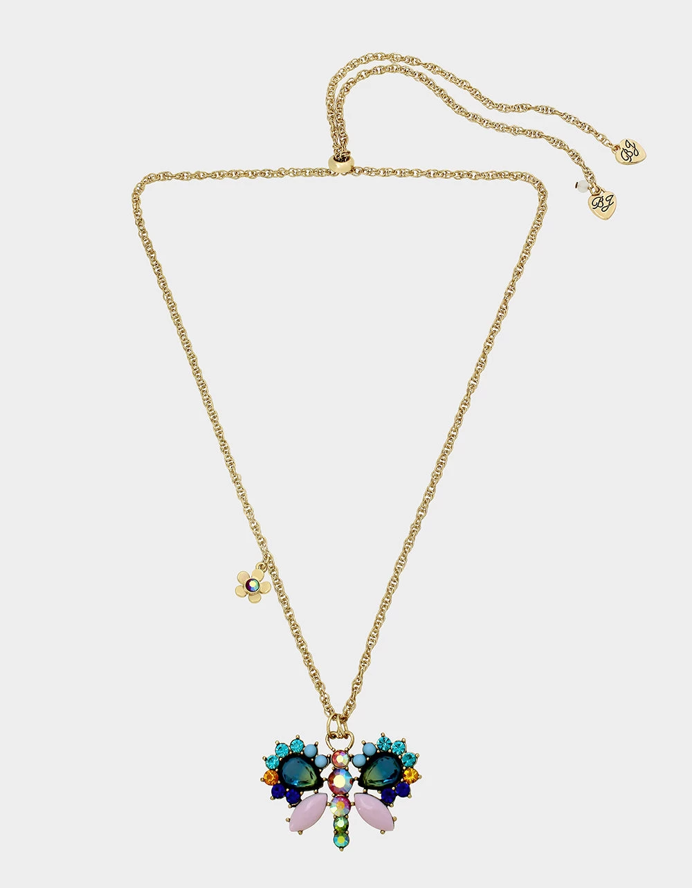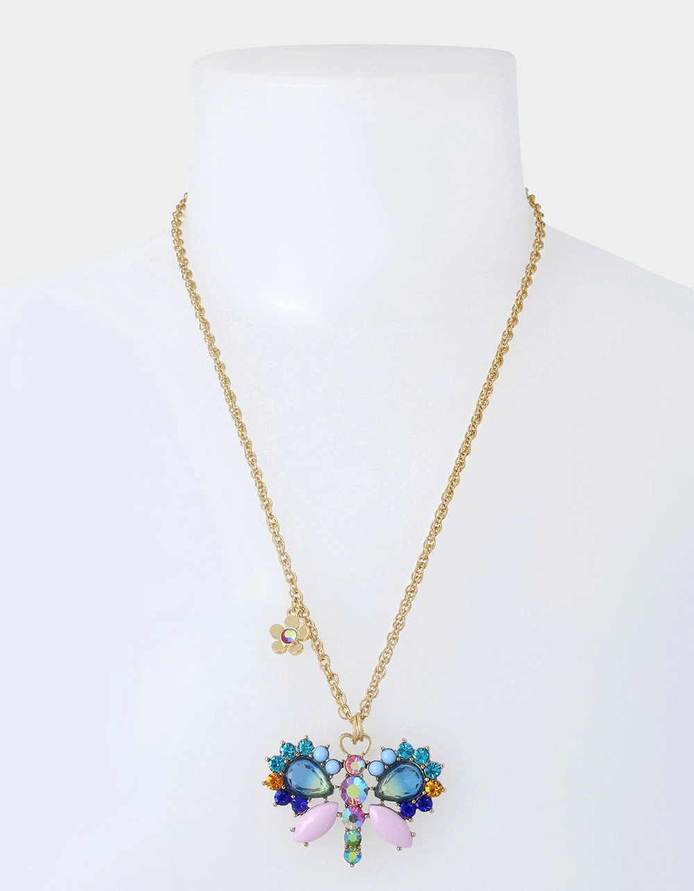 Refined chain slider necklace featuring small asymmetrical flower charm, and whimsical butterfly pendant adorned with colorful mixed stone gems and cabochons. Necklace has an adjustable slider closure. Made from polished metal, glass and resin.