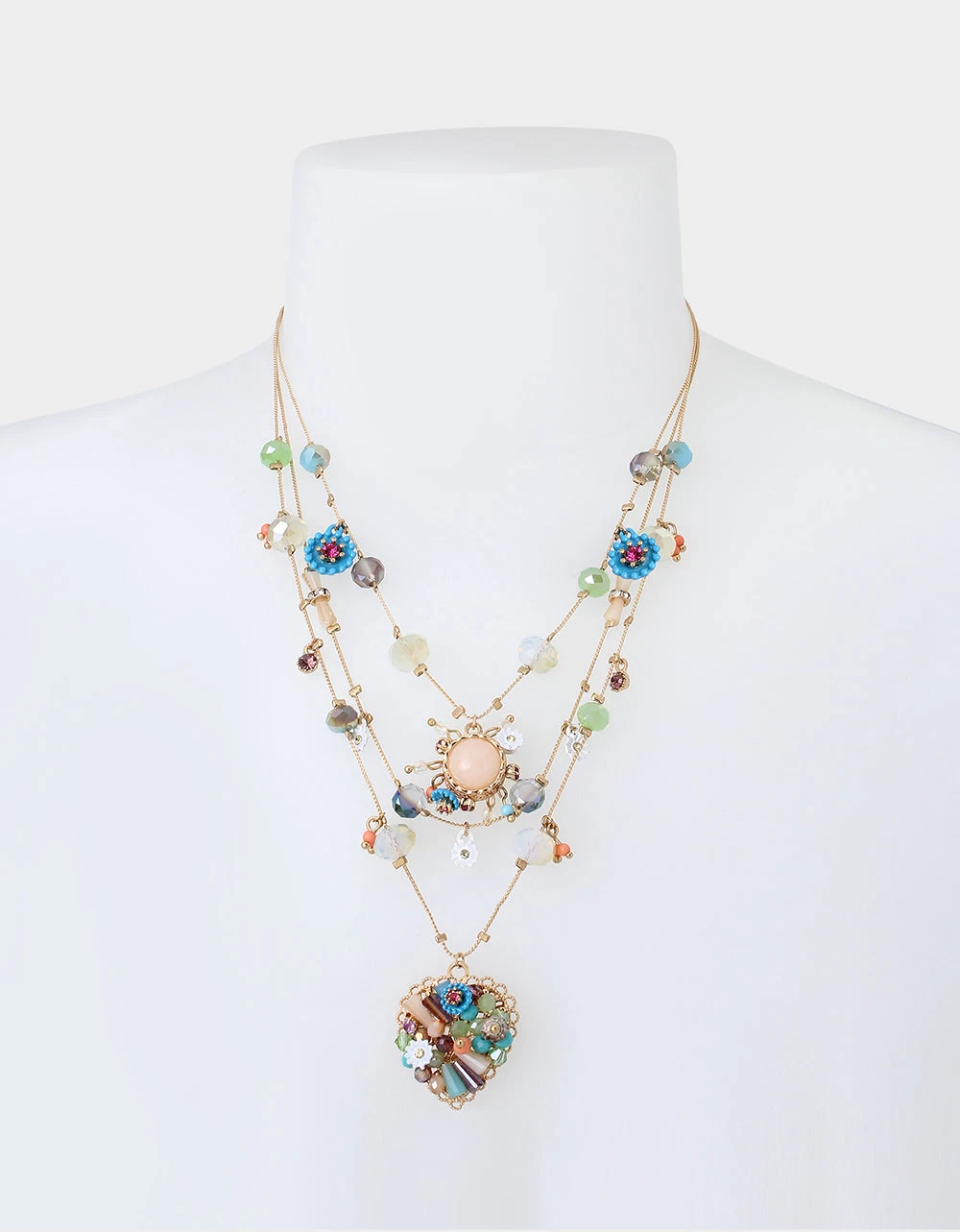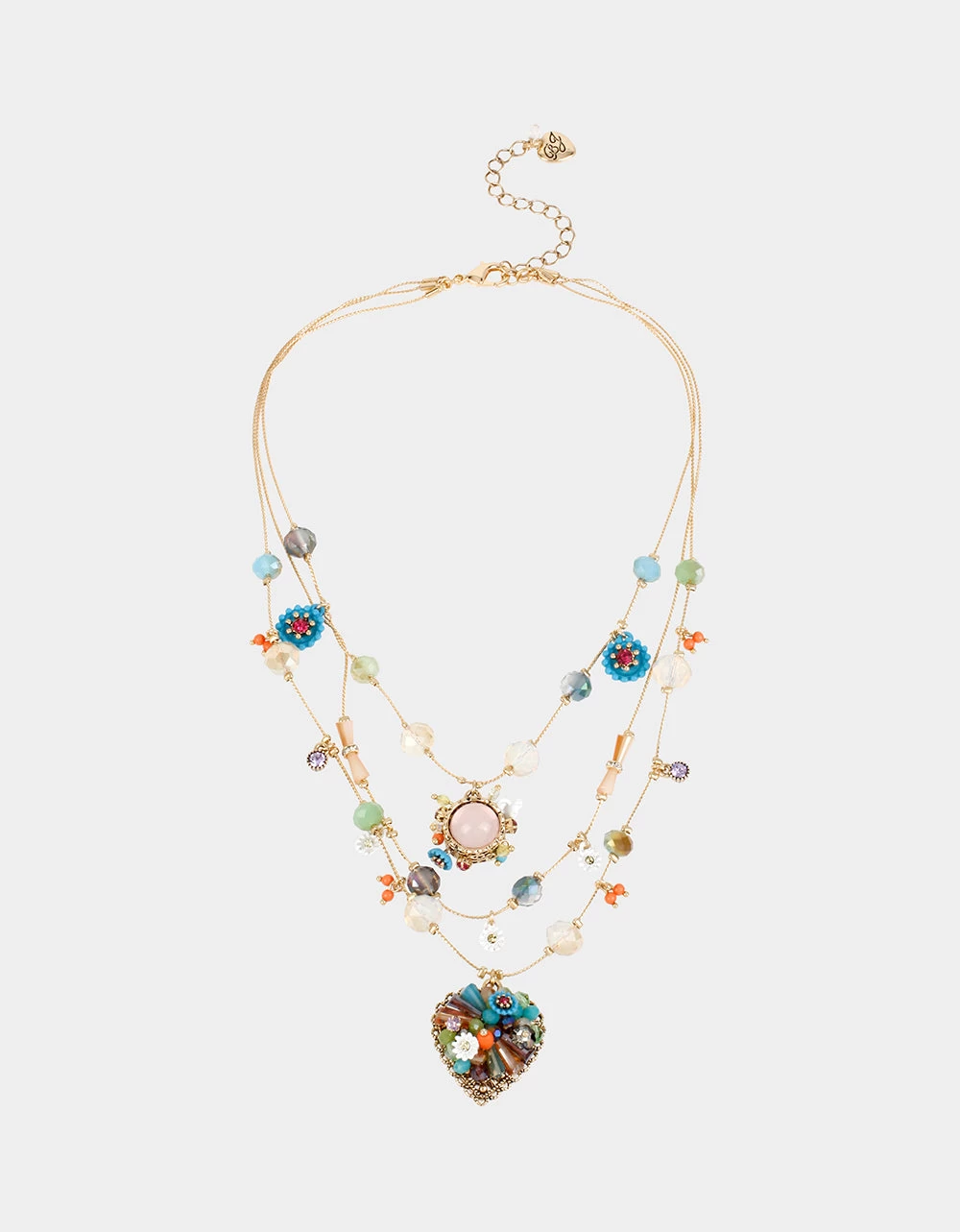 Multi-hued beads bedeck Betsey’s illusion-style necklace layered with love. Flower charms and crystals make it oh-so-trendy – a wonderful accessory for any season!