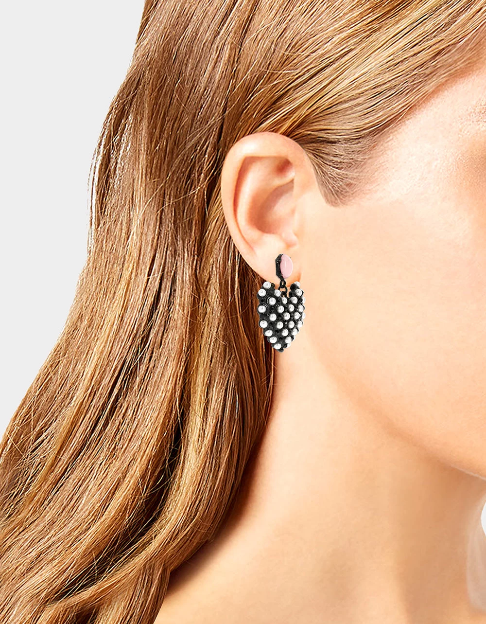 Black heart drop earrings adorned with pearls and pale pink cabochon accent at top. Earrings have a post back closure. Made from metal and plastic.al.