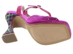 - Asymmetrical flared heel with multicolored rhinestone detailing.