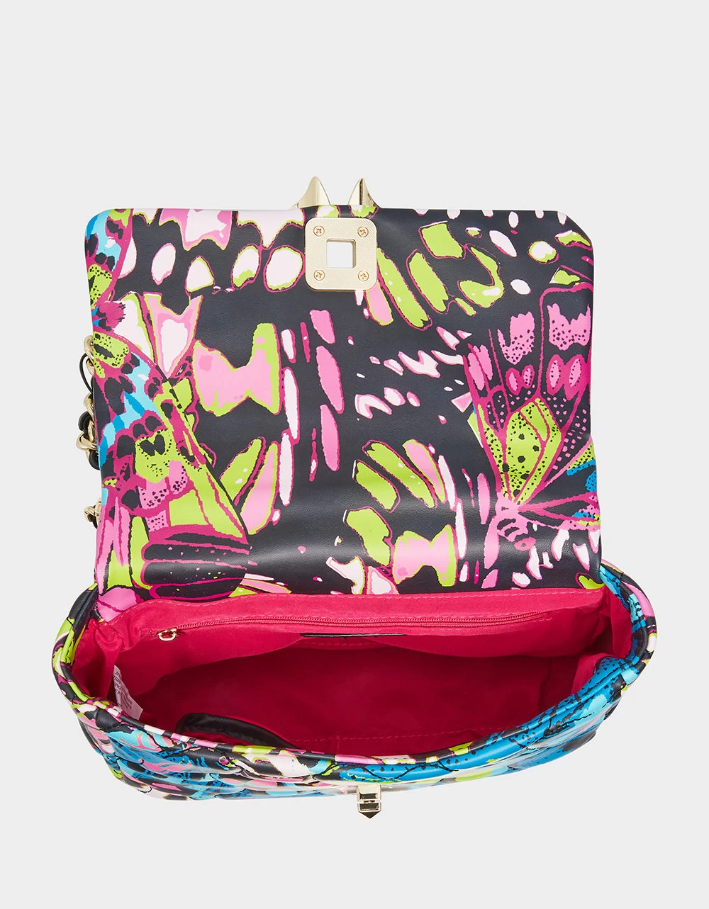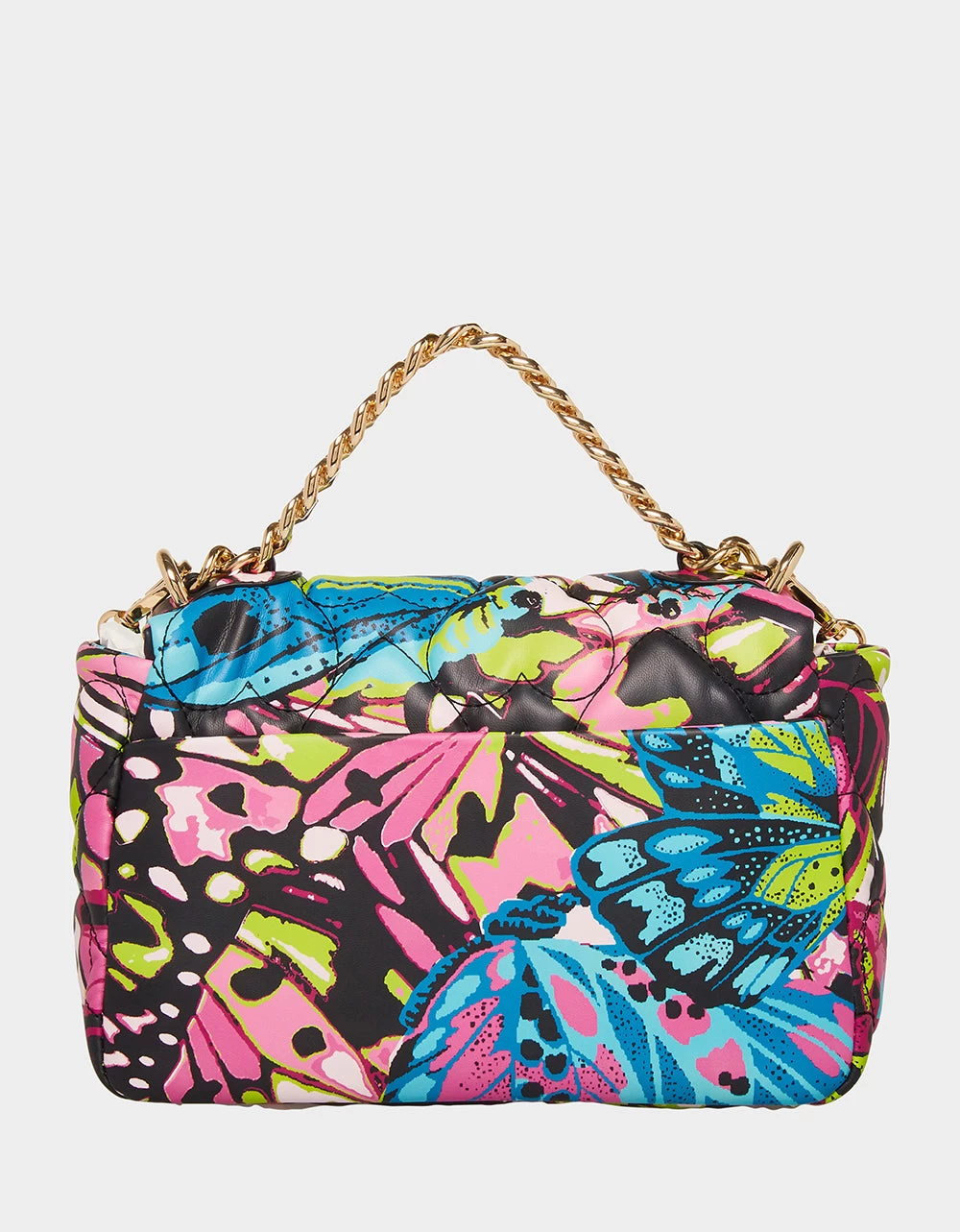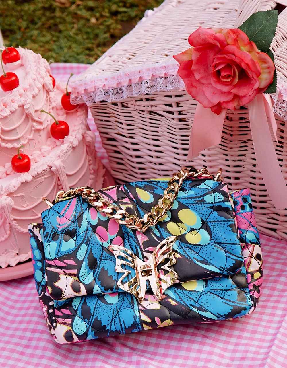 Elevate your style with the colorful BUTTERFLY LOCK crossbody bag. Decorated in gold-tone butterfly with quilted hearts.