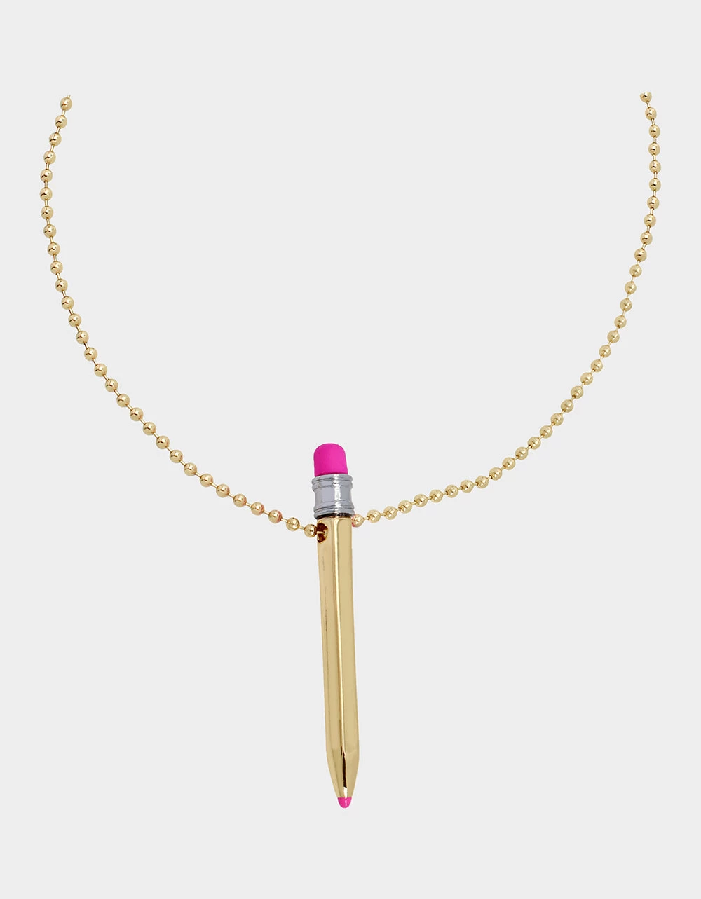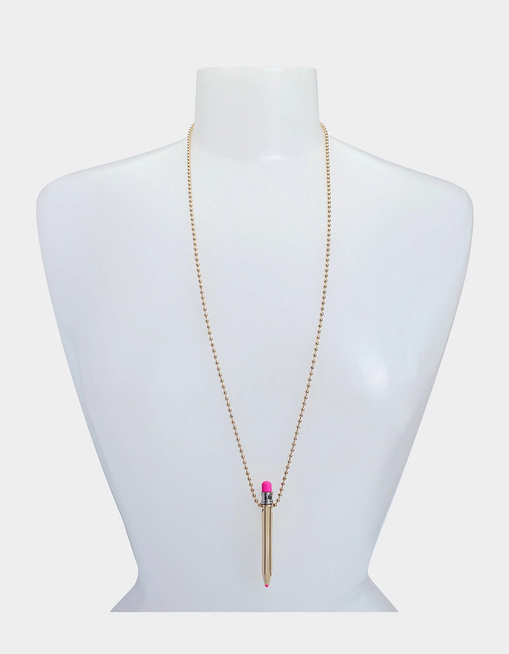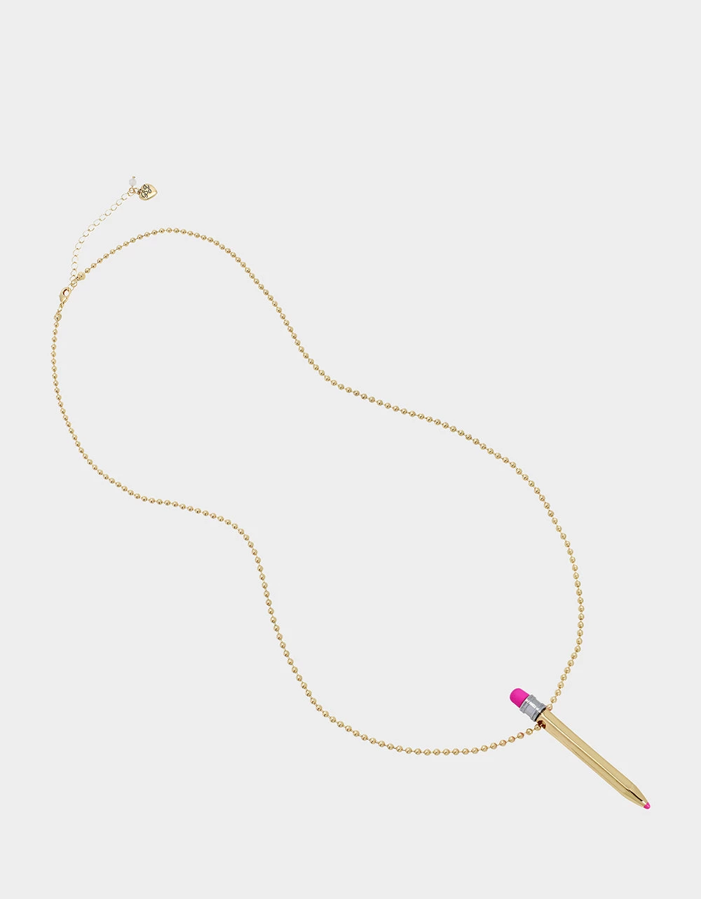 Long ball chain necklace featuring playful gold pencil pendant. The necklace has an adjustable lobster clasp closure. Made from metal and enamel.