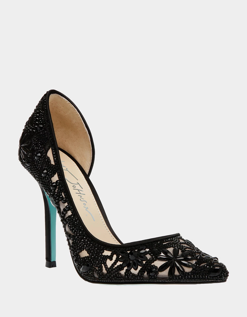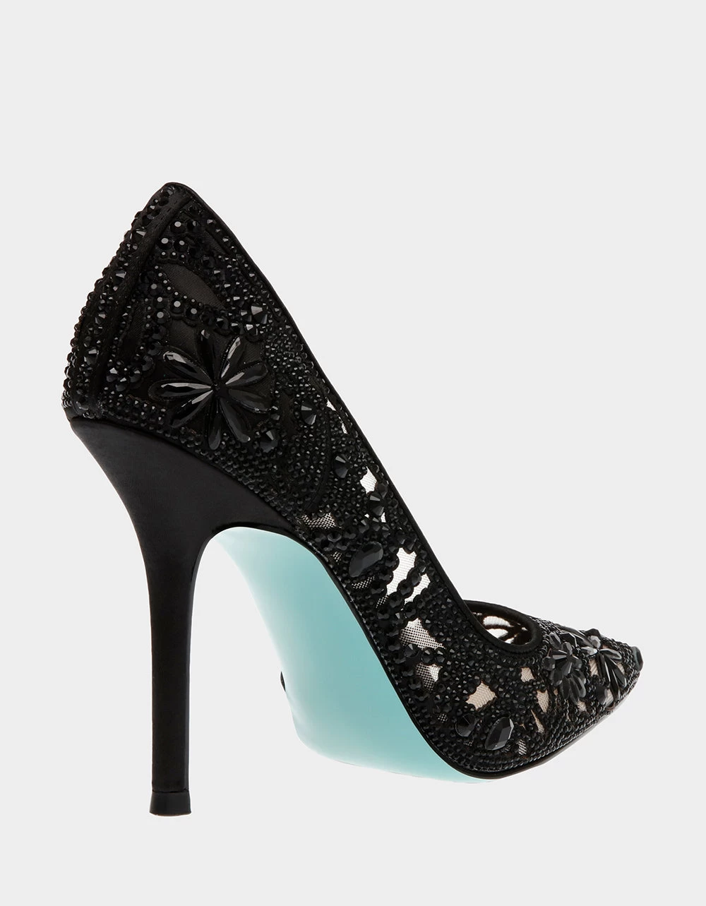 Step out in style in the CHIC patterned stone heel! Its pointed-toe and unique chop-out rhinestone design is embellished over sheer nude mesh providing a classic and sultry look.