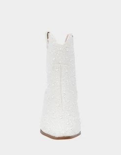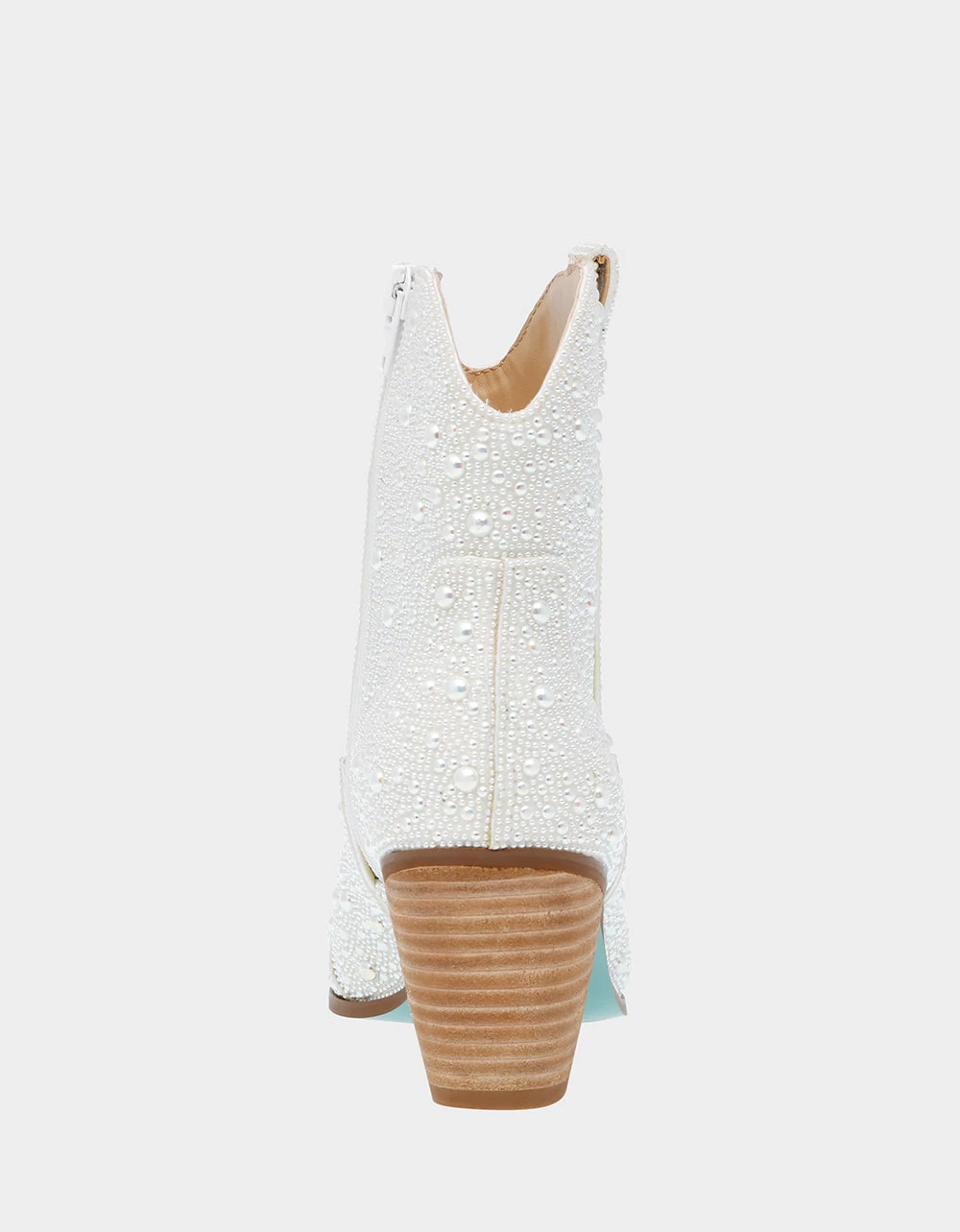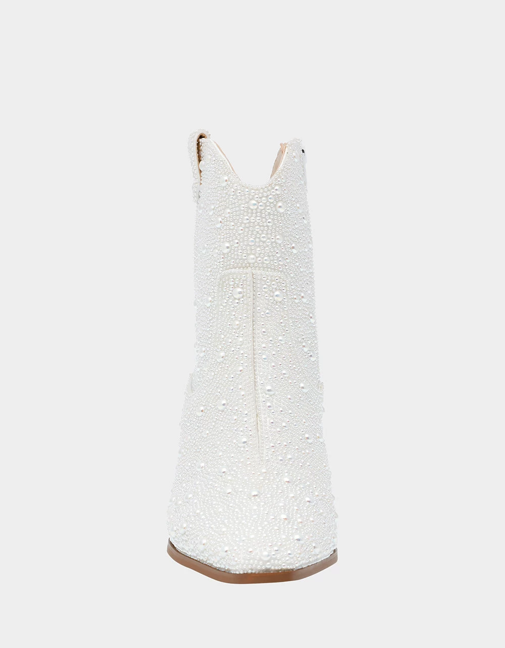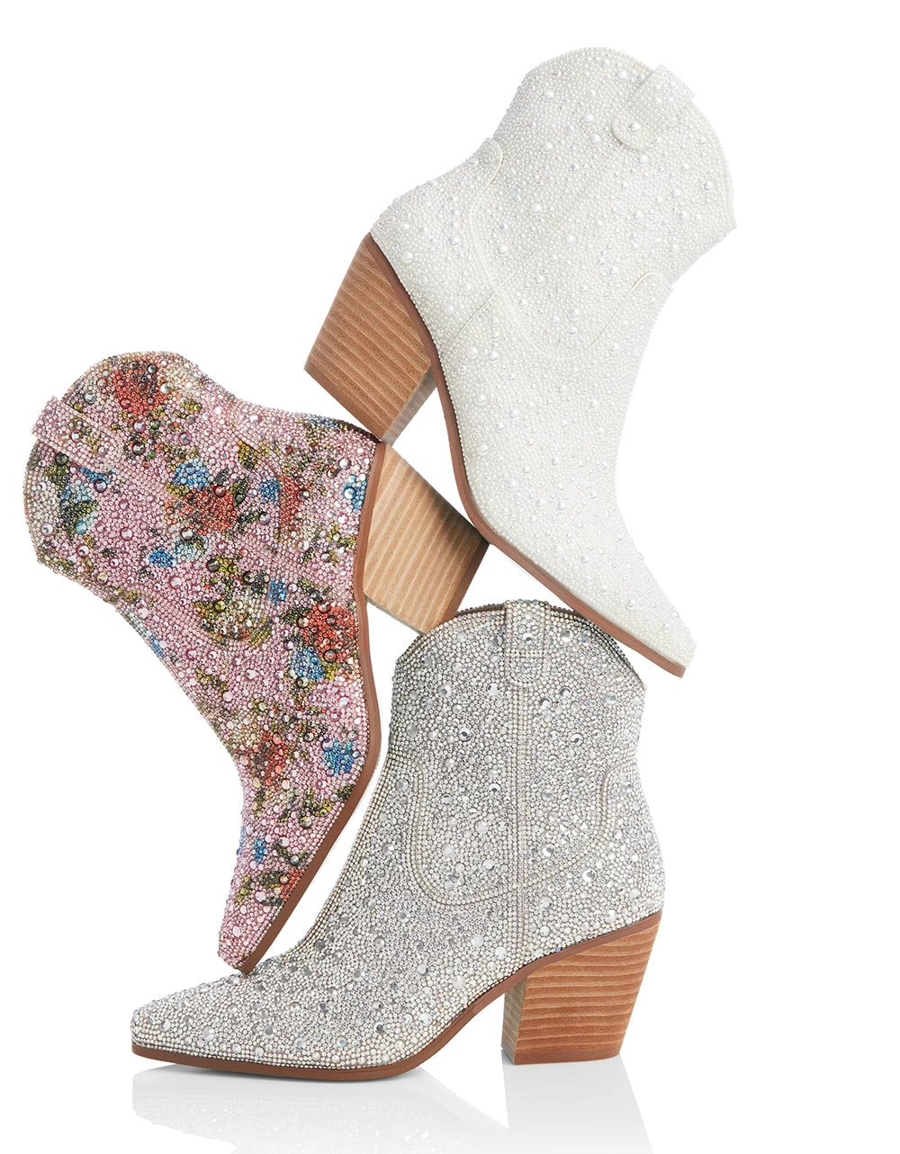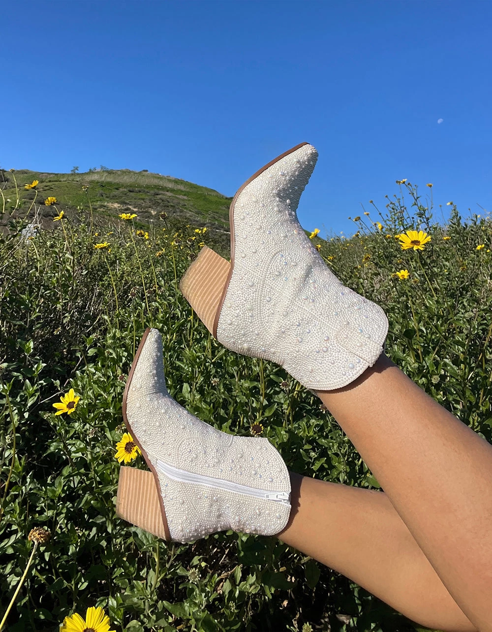 Step into this western-inspired era with the confidence of a DIVA, adorned in the glamorous all-over rhinestone pearl western booties. Dance to the music, and swift your feet to the beat during this festival and concert season, showcasing your style with these fun white boots.