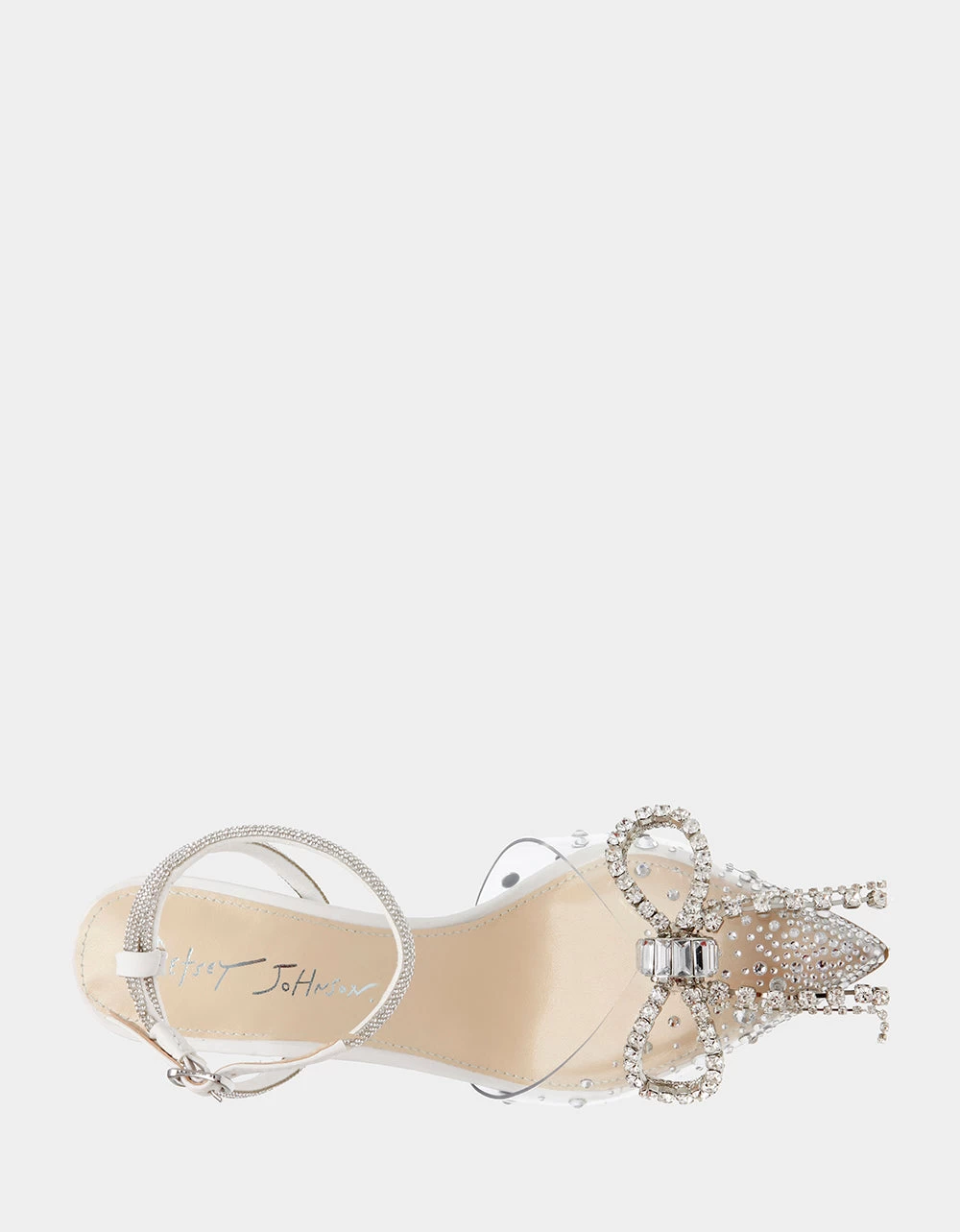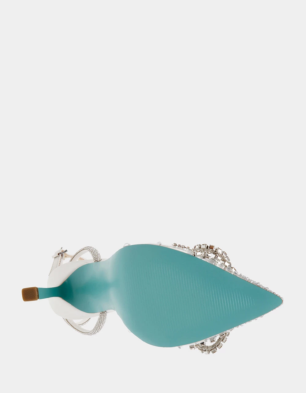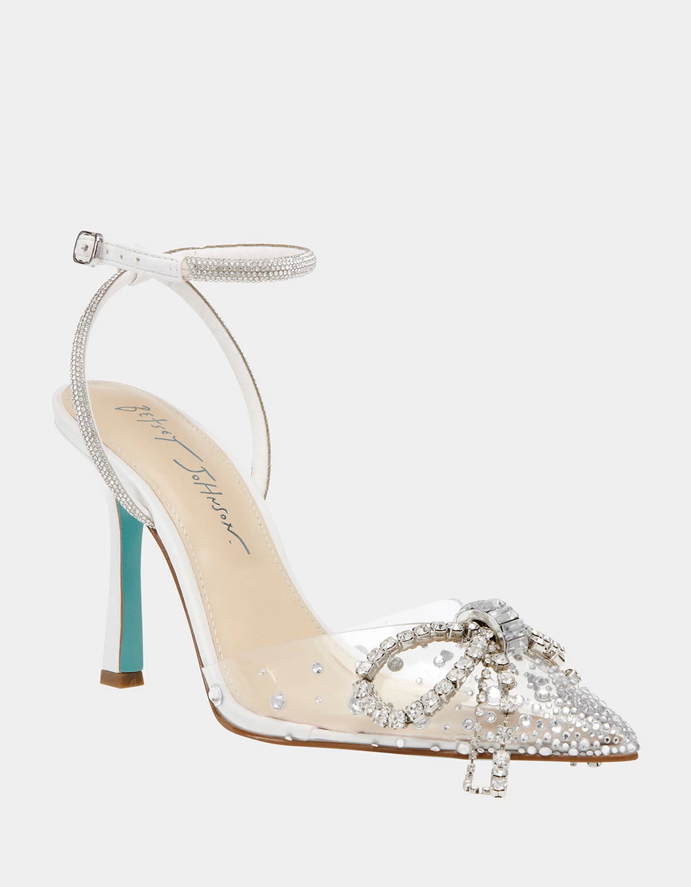 The DREA is a dress heel with bows you’ll wear for years to come. Set atop a slender stiletto heel, this pointed-toe pair features a slim embellished ankle strap and bow design.