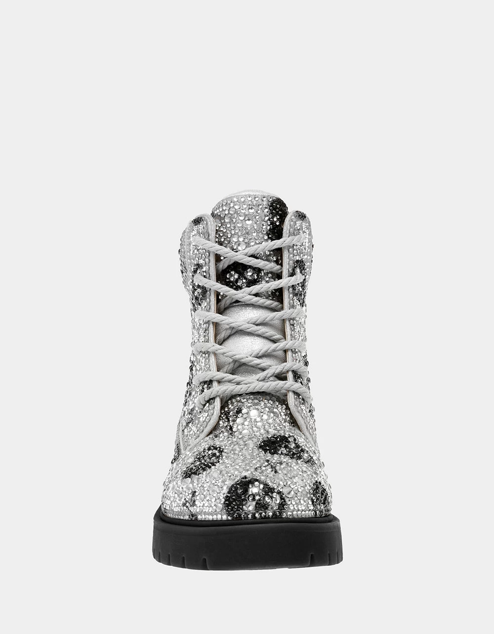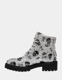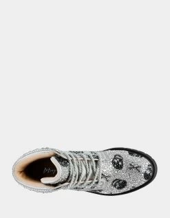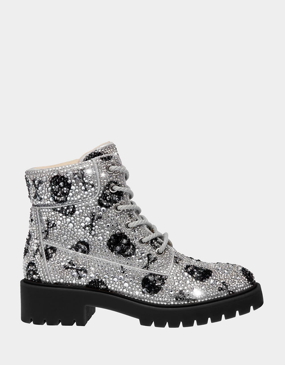 Add some sparkle to your look with a classic combat boot in all-over embellished rhinestones and pearls. Style these boots with your favorite party dress or casual jean.