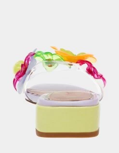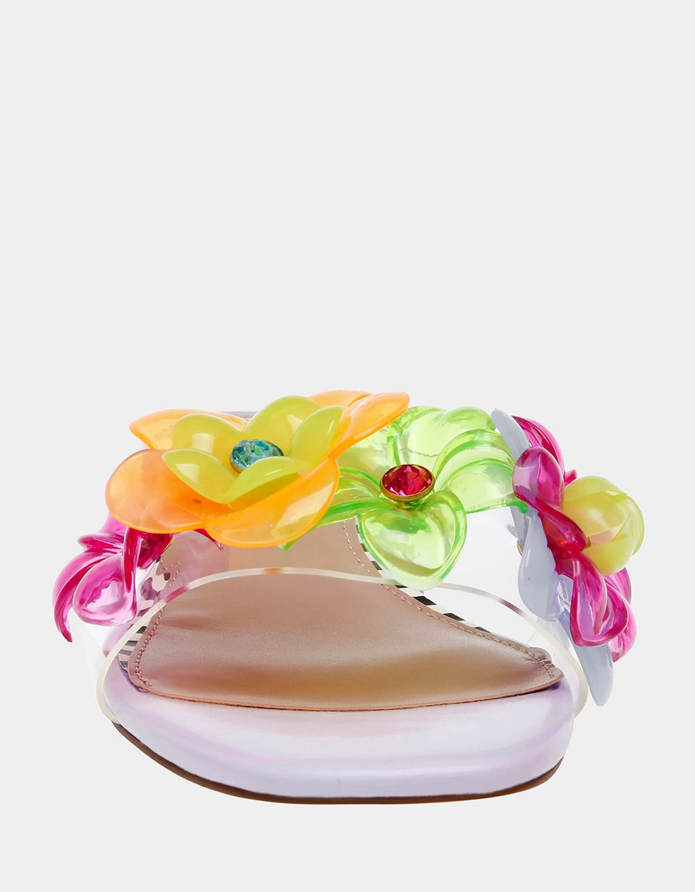 Step into a fresh, floral-inspired style with these sandal slides. Featuring bold colors and is adorned with transparent blooms on the toe strap.