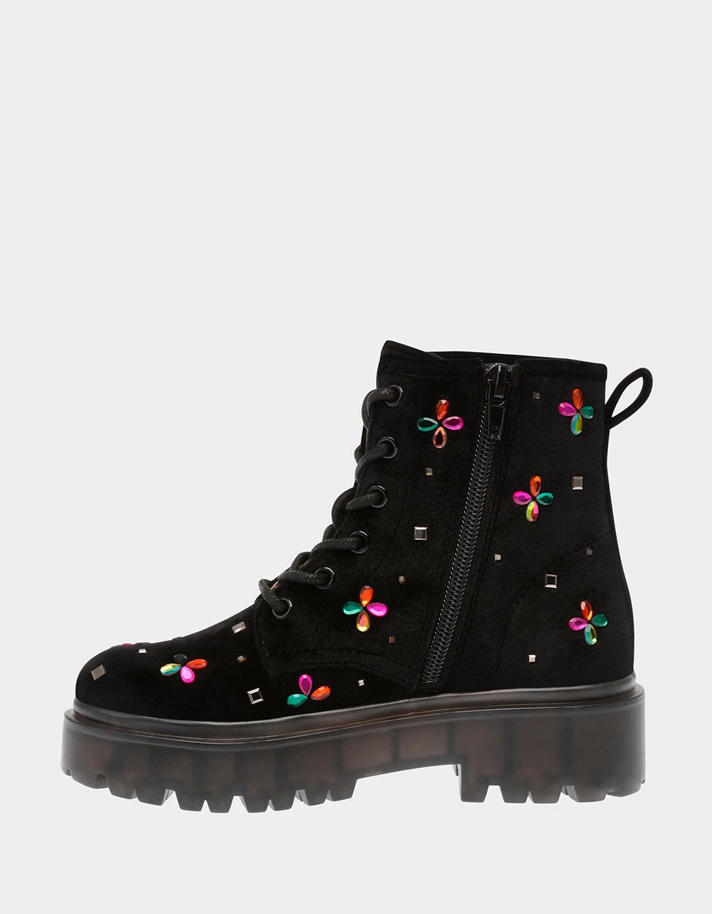 These EMBRY BLACK Booties are the perfect shimmery addition to your kid’s wardrobe! With a subtly glitzy rhinestone pattern, they’re sure to turn heads with style that shines! Whether your little one is heading off to school or out on a playdate, these booties will make them the star of the show.