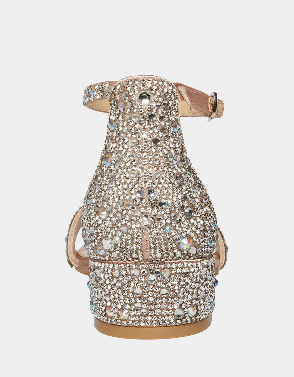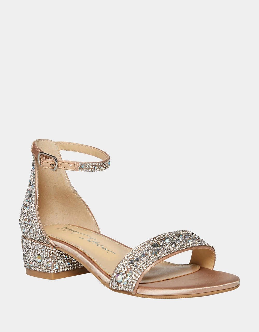 The Kids’ MARI heel is a gorgeous open-toed sandal glistening with stone embellishments. These sparkly block heels are ideal for any formal occasion. The sleek mid-low short kitten heels feature a comfortable and stable block heel with an adjustable ankle strap that will keep your little one dancing all night long.