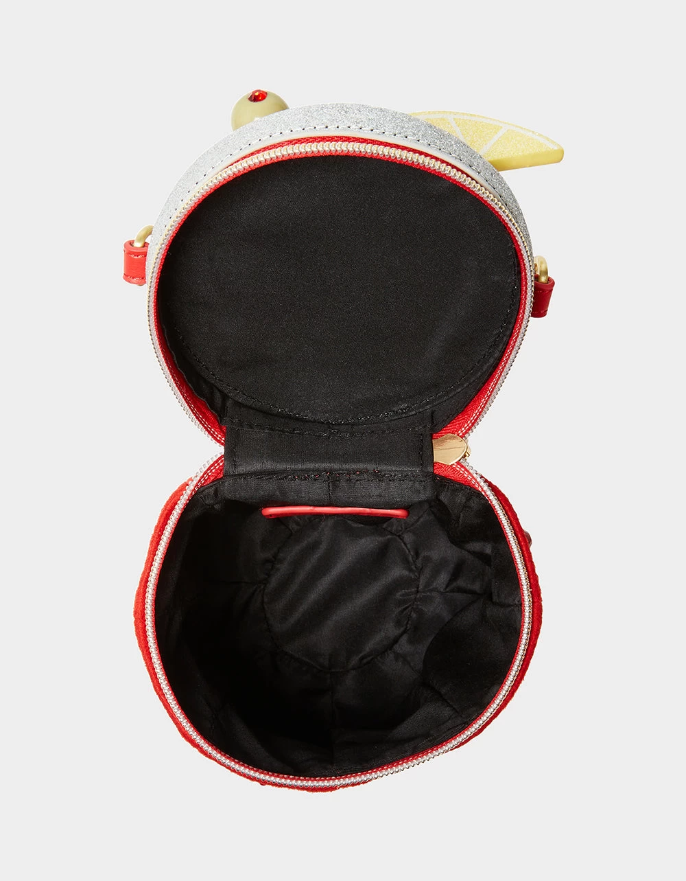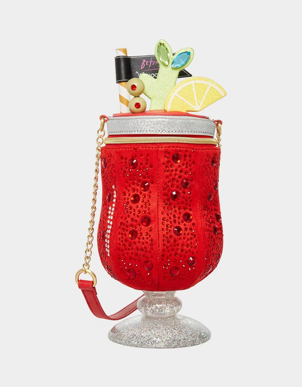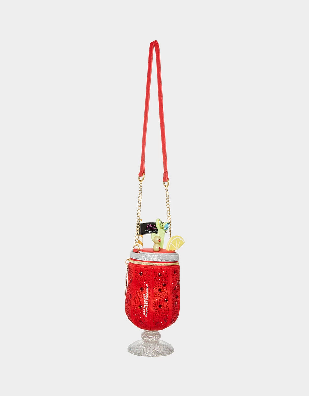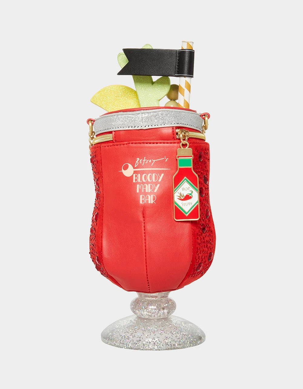 It’s Brunch O’Clock somewhere!! Be the talk at the table with this bloody mary cocktail-inspired crossbody bag. It features a glitzy rhinestone exterior, a metal hot sauce zipper pull, toppers for garnish, and a molded glitter bottom to stand up tall at the table. Cheers!!