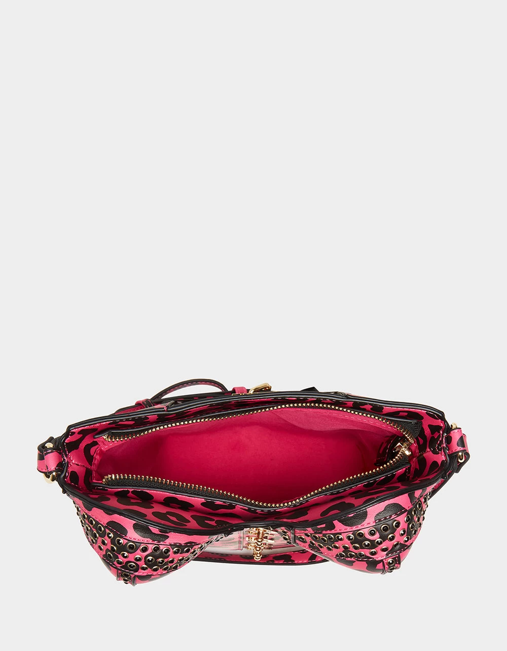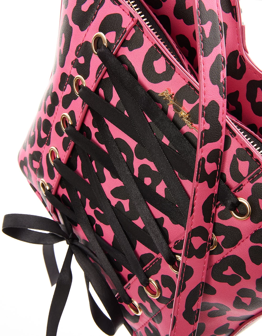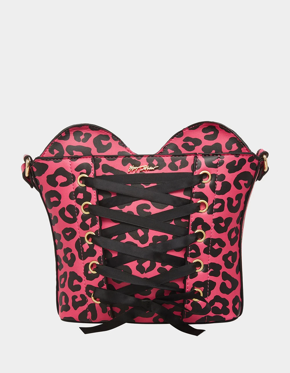 Make a statement and turn heads with our captivating kitsch bustier corset-shaped handbag. This pink leopard crossbody features a convenient top zipper opening, charming front hook details, and an alluring lace-up detail on the back, making it the perfect blend of functionality and fashion.
