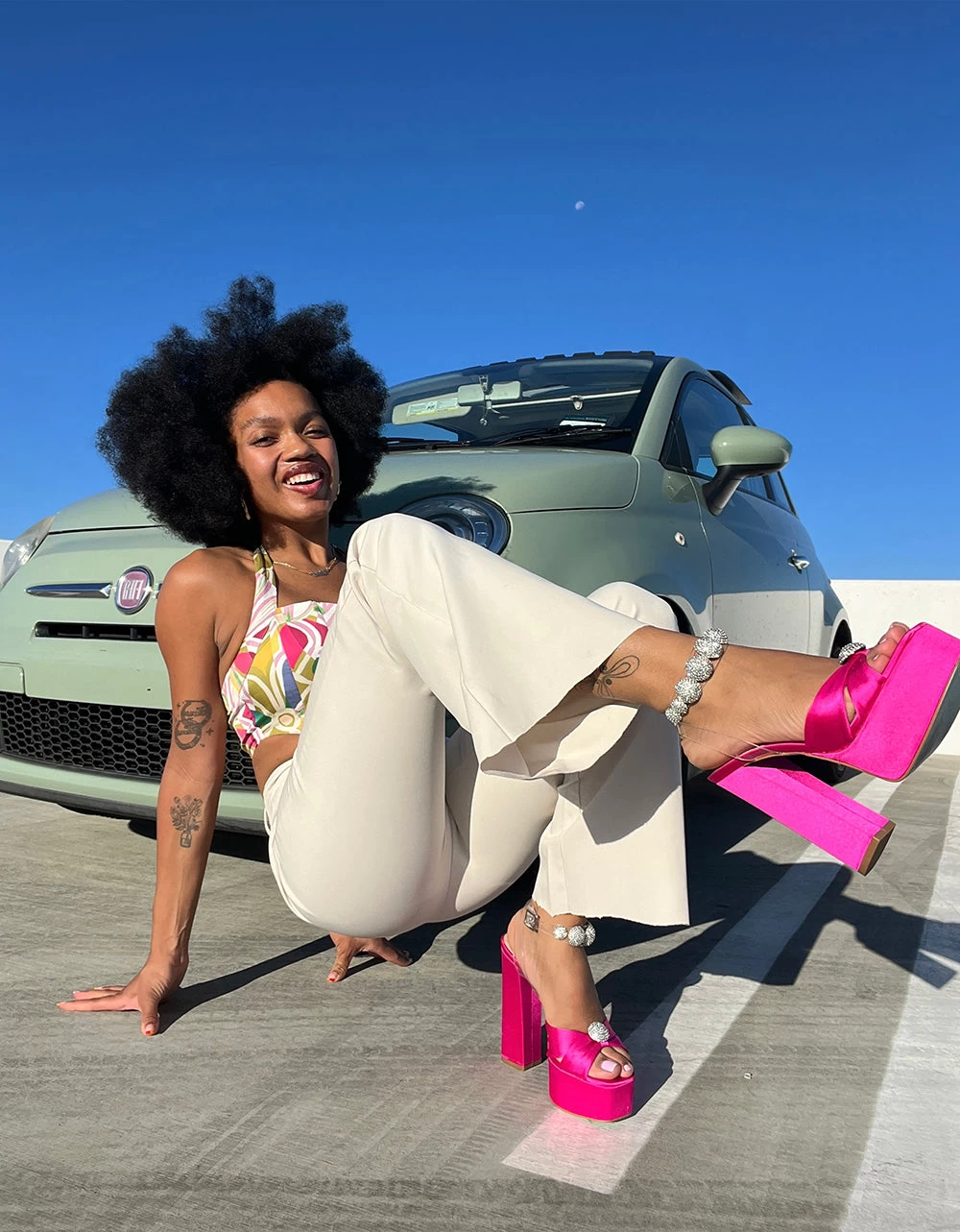 This glamorous sandal features a sleek satin heel adorned with shimmering crystal ornaments and clear straps.