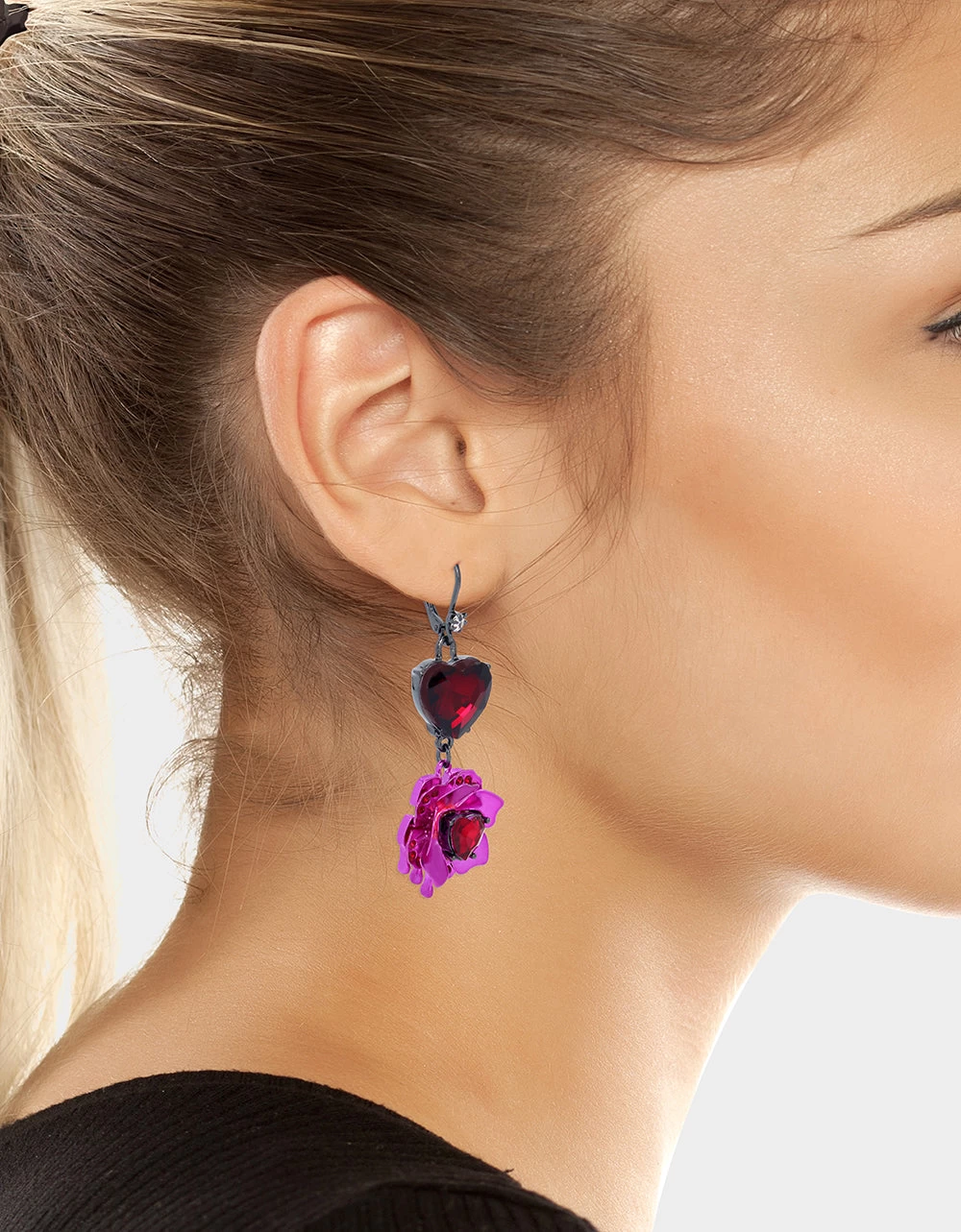 Vibrant mismatched drop earrings featuring fuchsia flowers paired with red stone hearts. Earrings have a lever back closure. Made from metal, enamel and glass.