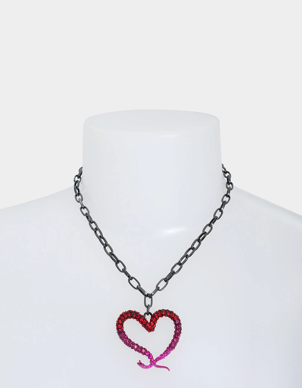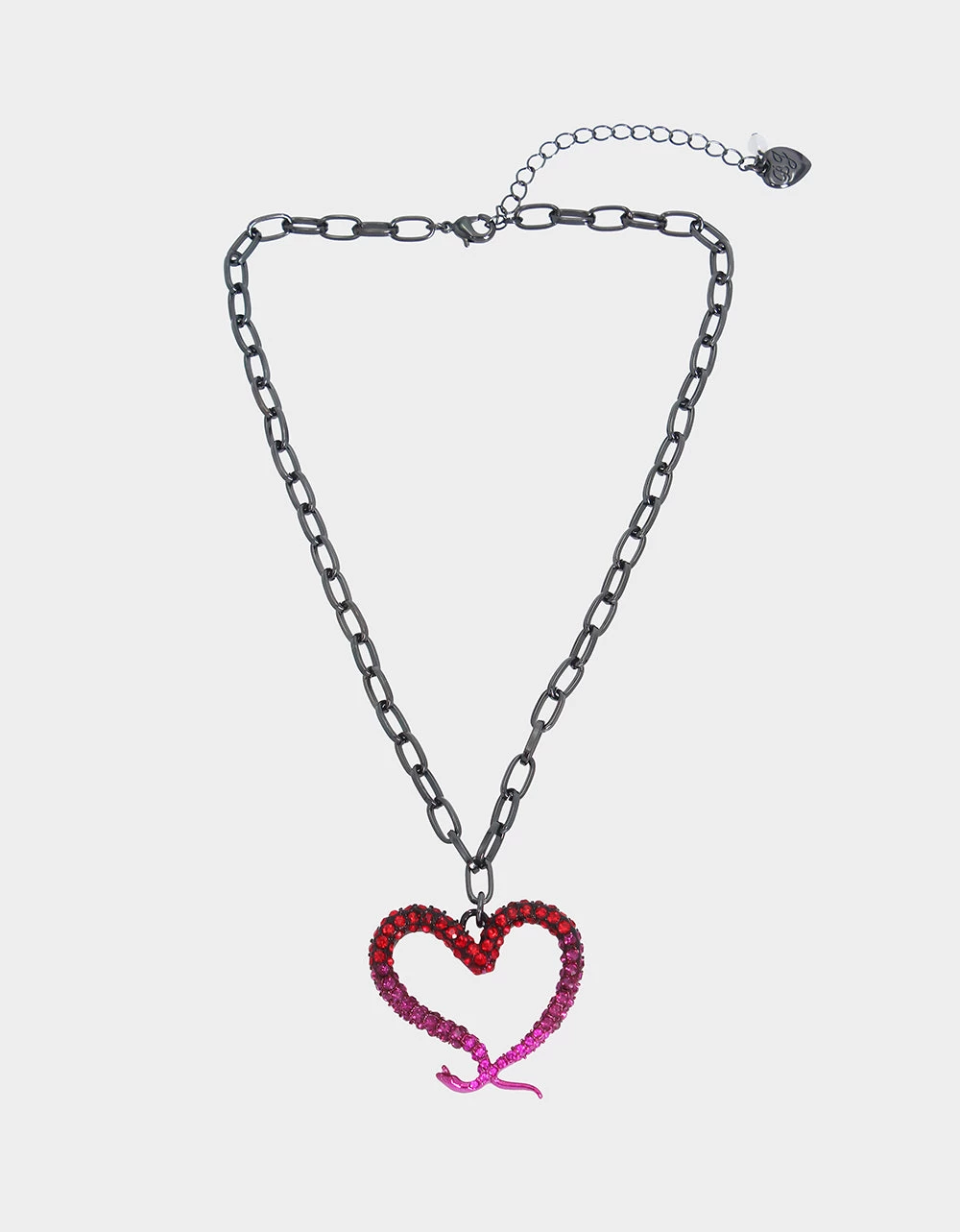 Striking chain link necklace featuring slithering snake heart motif pendant adorned with glistening fuchsia tonal pave. The necklace has an adjustable lobster clasp closure. Made from metal, glass, and enamel.