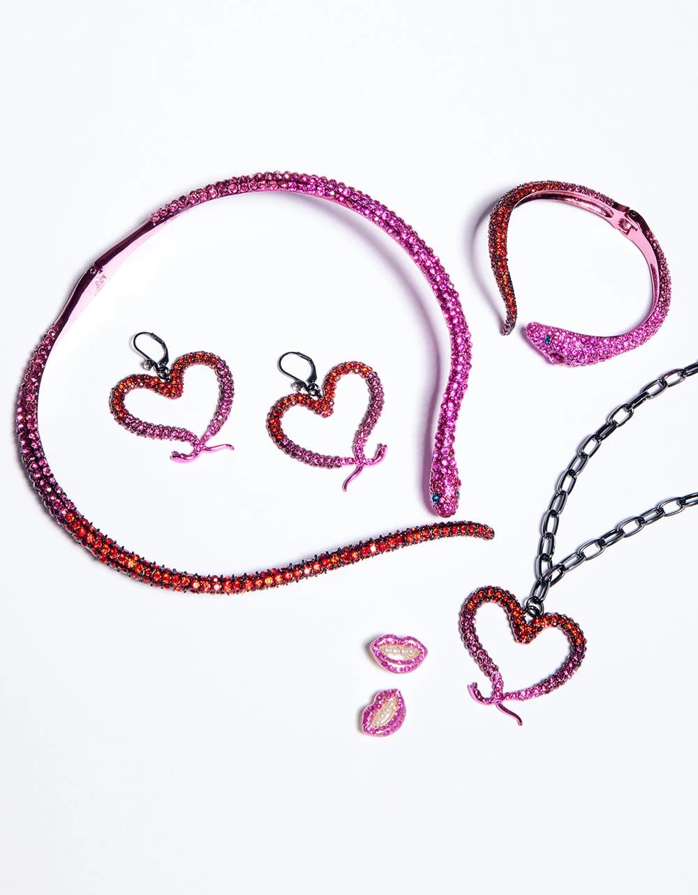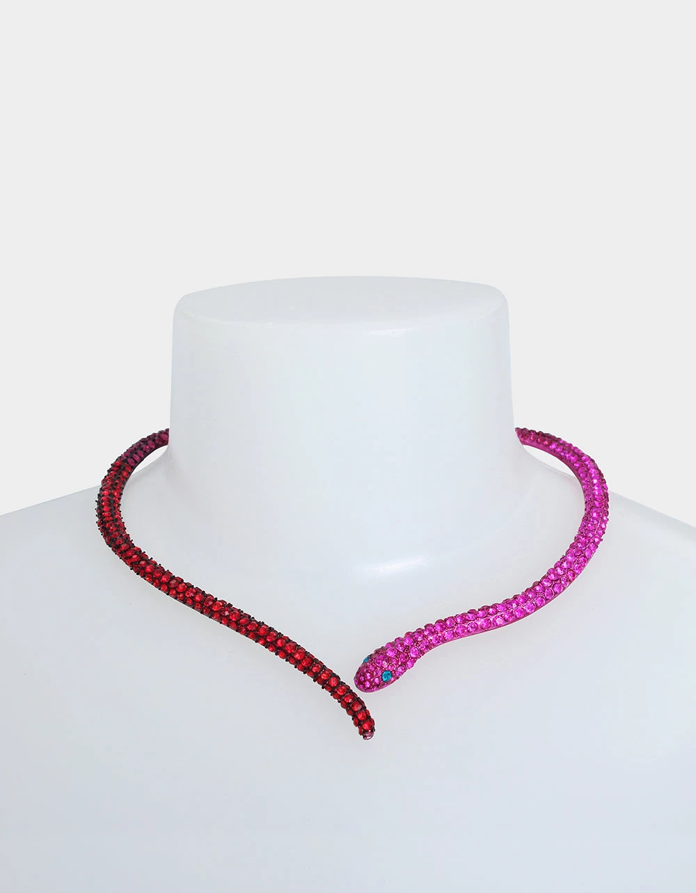 Striking snake motif hinged collar necklace adorned with glistening fuchsia tonal pave. The necklace has an easy hinge closure. Made from metal, enamel, and glass.
