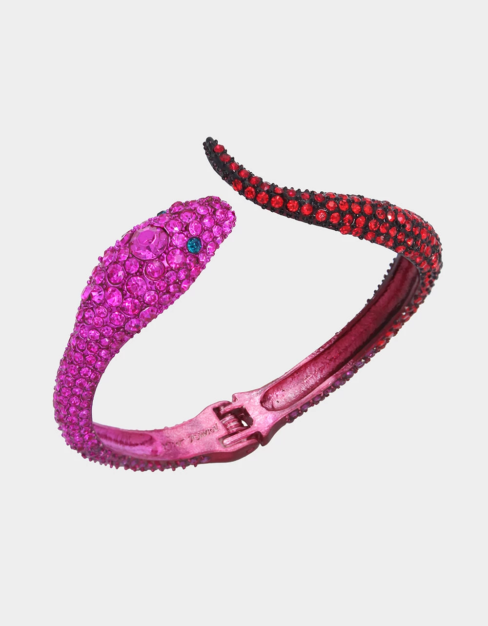Striking snake motif hinged bangle bracelet adorned with glistening fuchsia tonal pave. Bracelet has an easy hinge closure. Made from metal, enamel and glass.