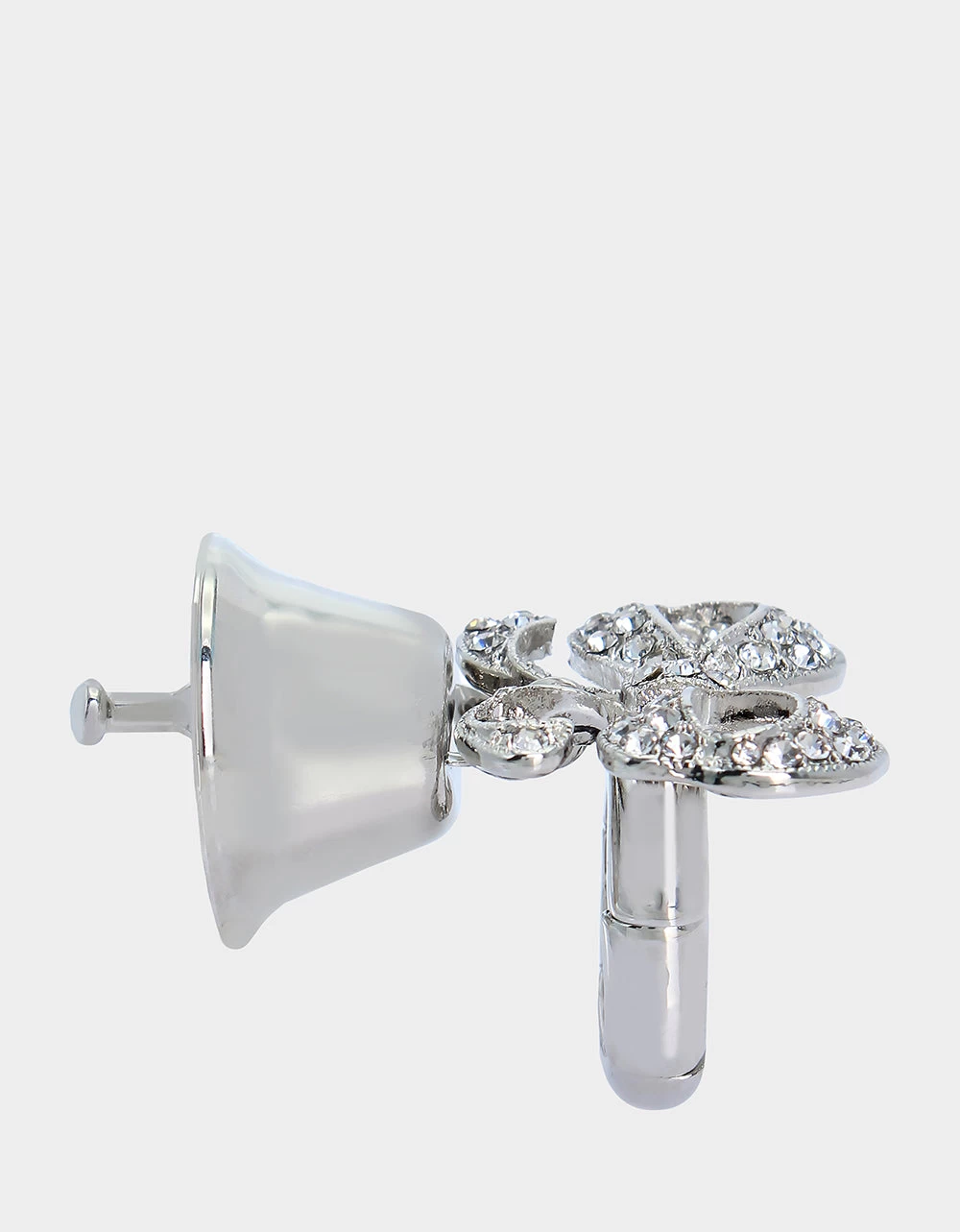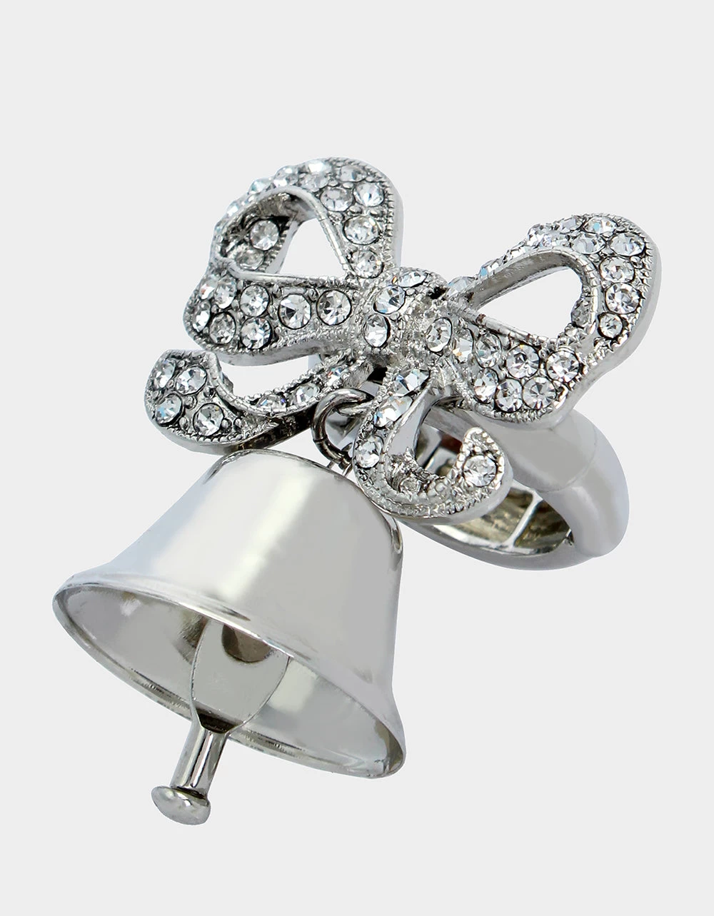 Chime in on the big day with this wedding bell ring! This whimsical cocktail ring features a glistening bow paired with a dangling cowbell. Ring is size 7 with an easy stretch closure. Made from rhodium finish metal and glass crystal.