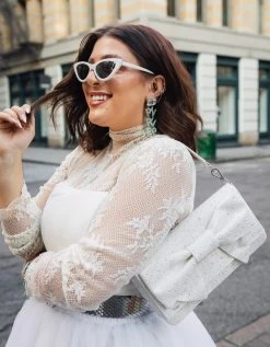 Playful mismatched linear earrings featuring glistening emerald cut stone gem paired with dangling PRE-NUP adorned with delicate stones. Earrings have an omega post back closure. Made from rhodium finish metal and glass crystal.