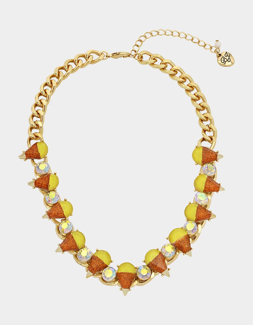 Sturdy chain necklace featuring playful candy corn motifs and stone gems at front. Necklace has an adjustable lobster clasp closure. Made from metal, glass and epoxy.