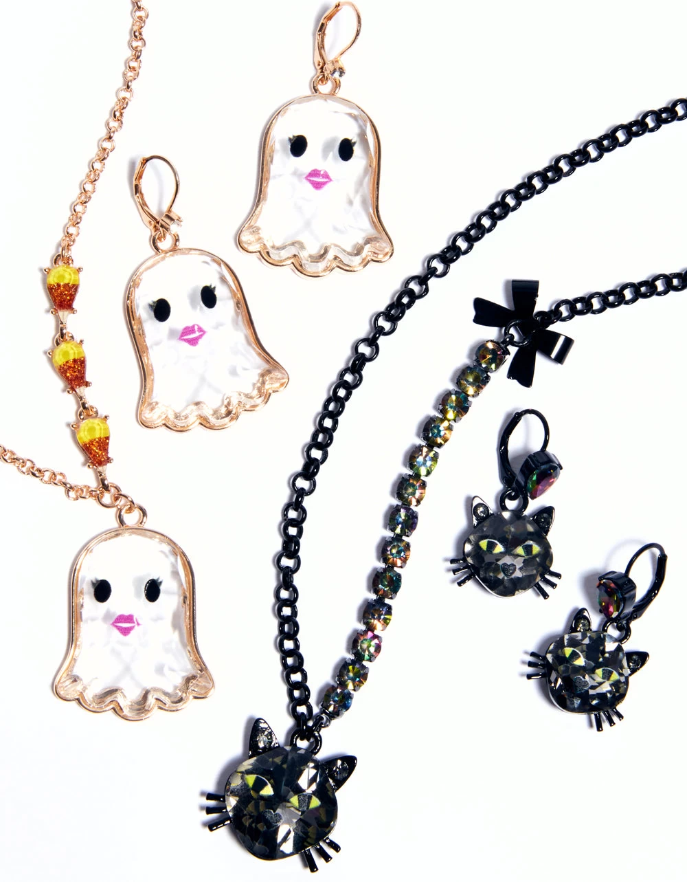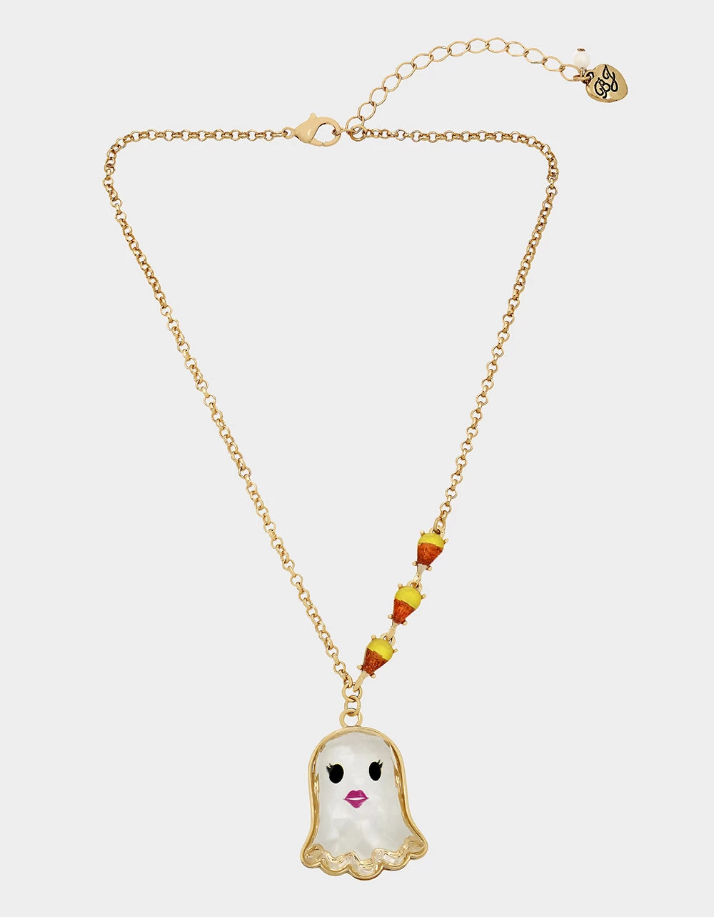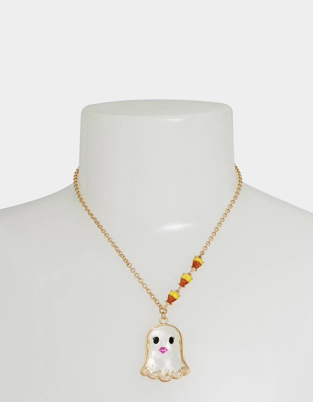 Refined chain necklace featuring delicate candy corn motif gems paired with playful ghost faceted pendant. Necklace has an adjustable lobster clasp closure. Made from metal, epoxy and glass.