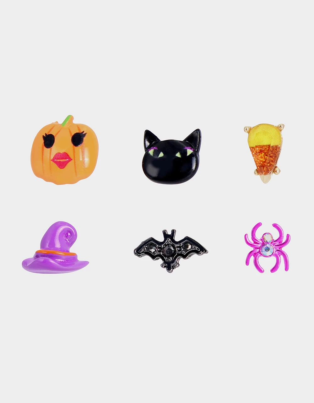 Playful Halloween stud earring set featuring pumpkin, black cat, candy corn, witchy hat, candy corn, bat and vibrant pink spider. Set includes 6-single earrings perfect to mix and match. Earrings have a post back closure. Made from metal and glass.