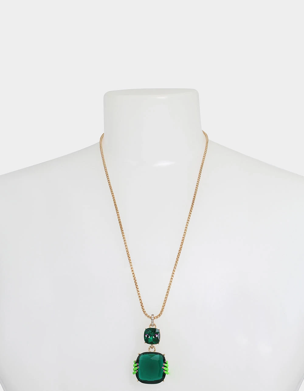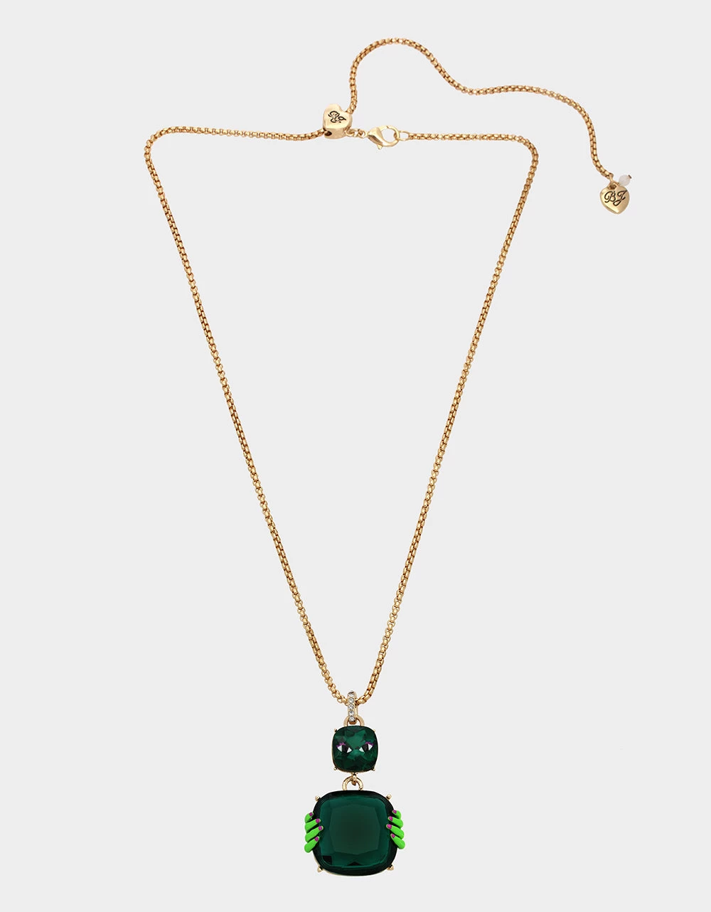 Refined chain slider necklace featuring vibrant green double stone pendant adorned with playful witchy eyes and hands. Necklace has an adjustable slider and lobster clasp closure. Made from metal and glass.