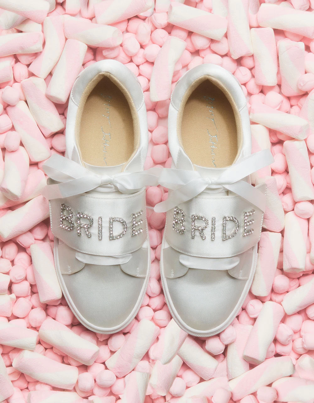 Steal the show on the dance floor in the SB-Liana wedding sneaker! This shoe is fashioned with a rhinestone embellished band featuring “Bride” text at the top .