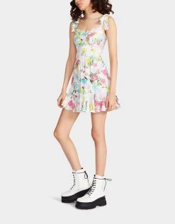 Fall in love with the romantic TULLUAH MINI dress. It features vibrant floral prints, a sweetheart neckline, a bustier-inspired bodice, tie shoulder straps, and a fitted waist, creating a perfectly flattering silhouette.