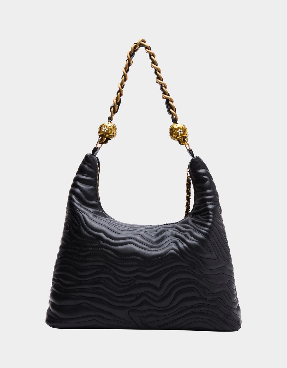 This edgy skull bag is sure to make a statement! In classic black, it features a sleek silhouette with skull head details that will add a dastardly touch to any outfit.