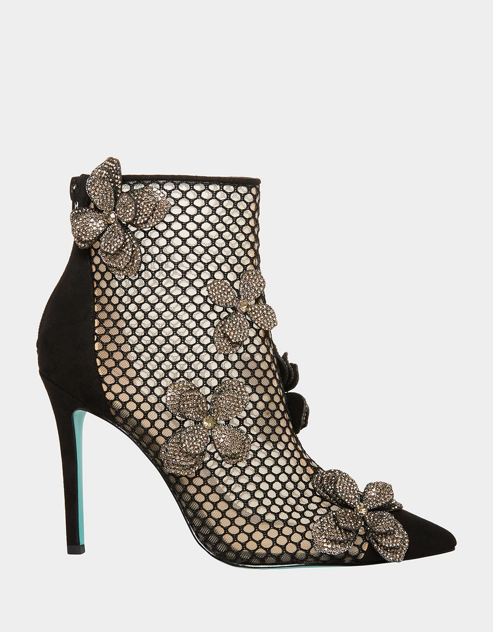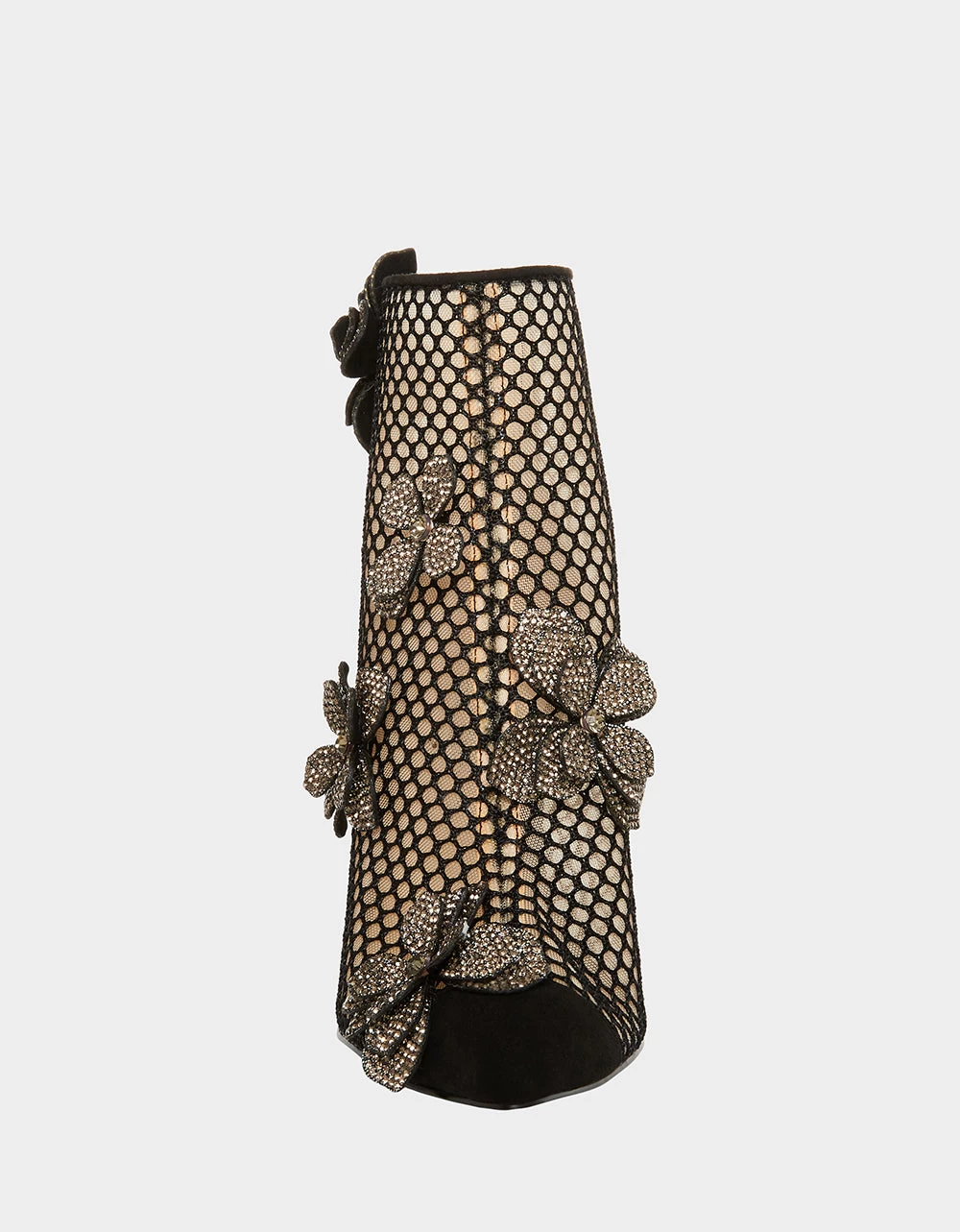 Look totally extra in these URSA BLACK booties! Show off your style with the mesh fishnet and floral stone appliques, and you’re sure to turn heads wherever you go.